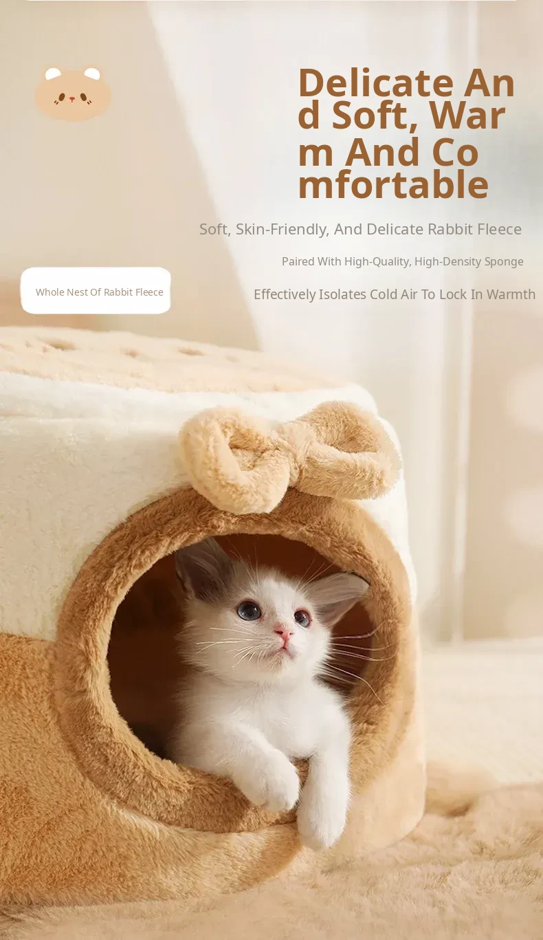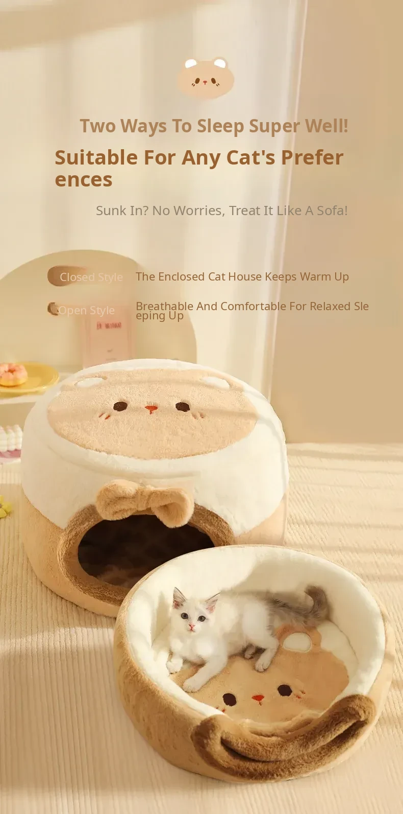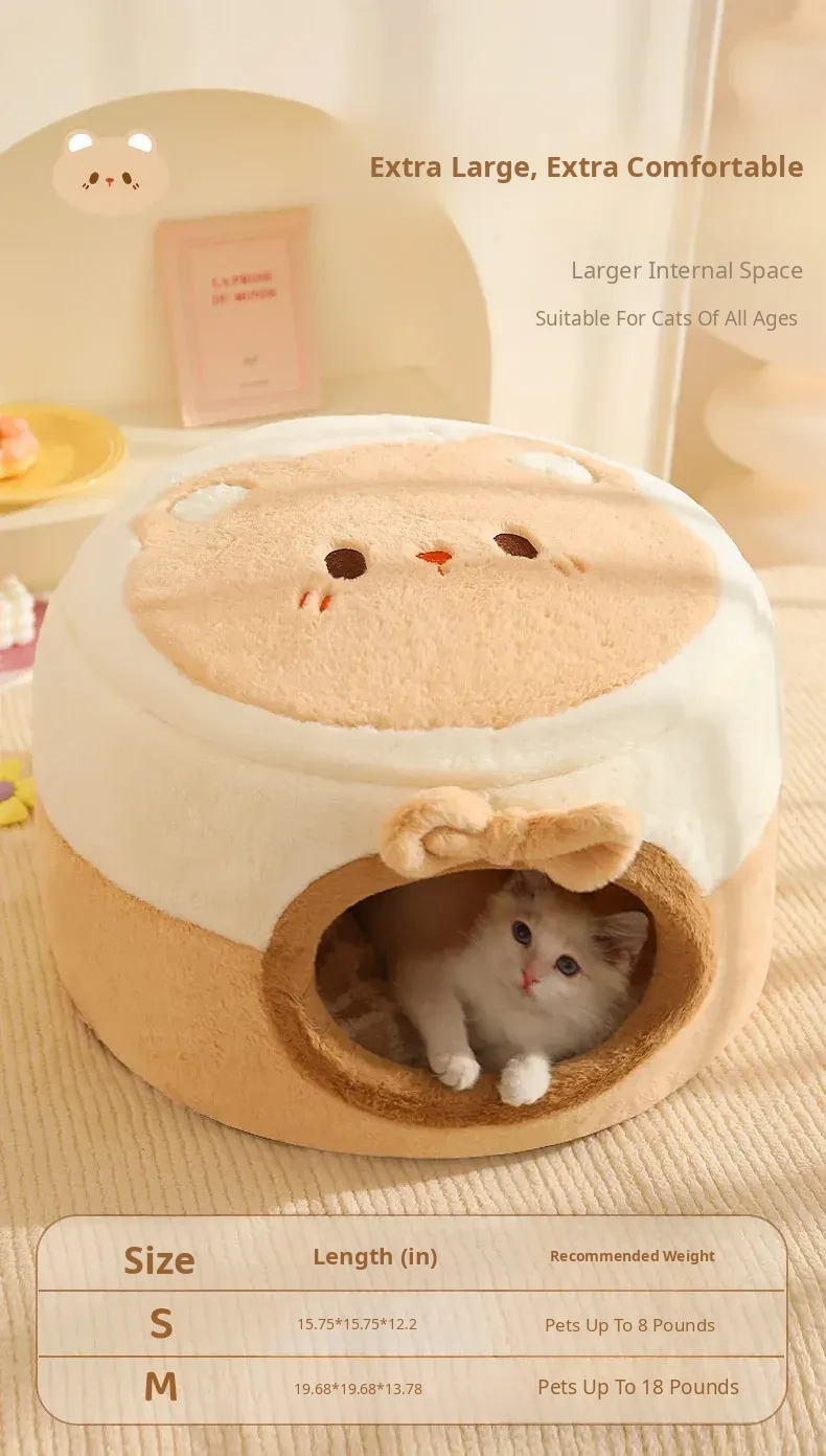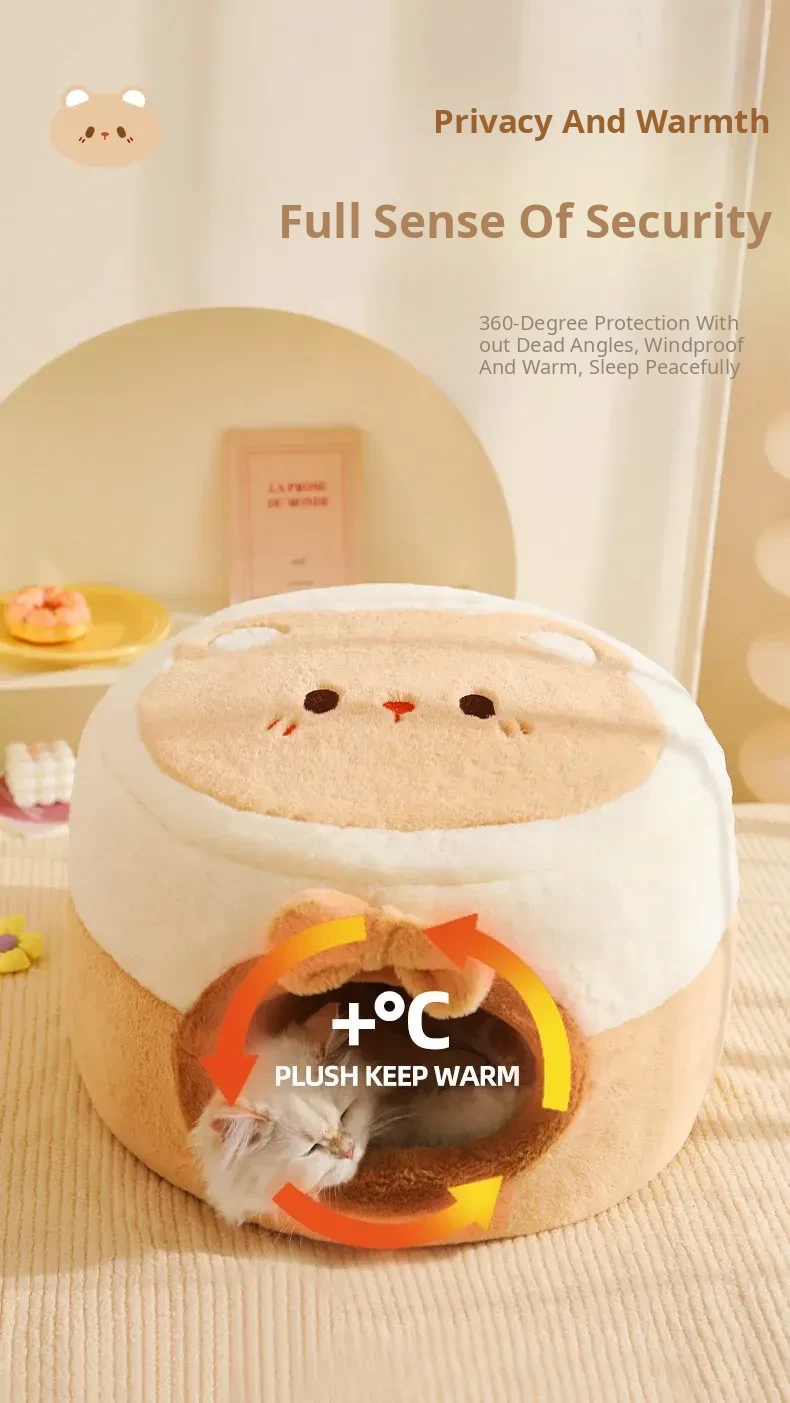 Warm Bear Enclosed Cat Nest + Comfortable Cotton Velvet Blanket*1