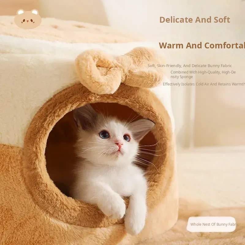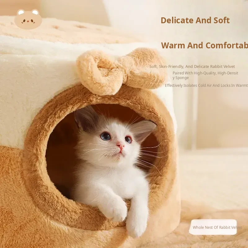Warm Bear Enclosed Cat Nest + Comfortable Cotton Velvet Blanket*1