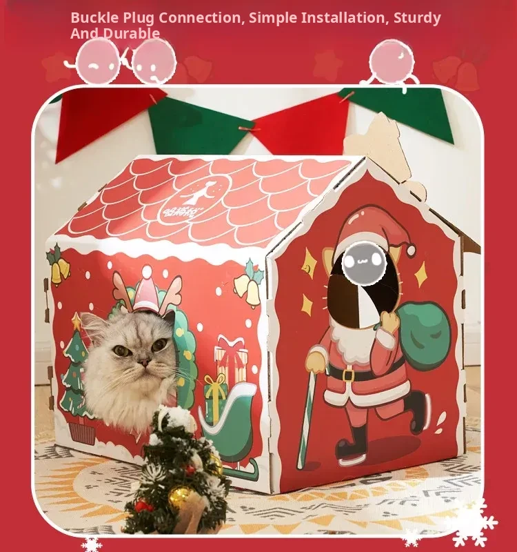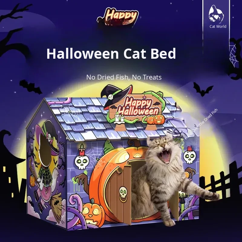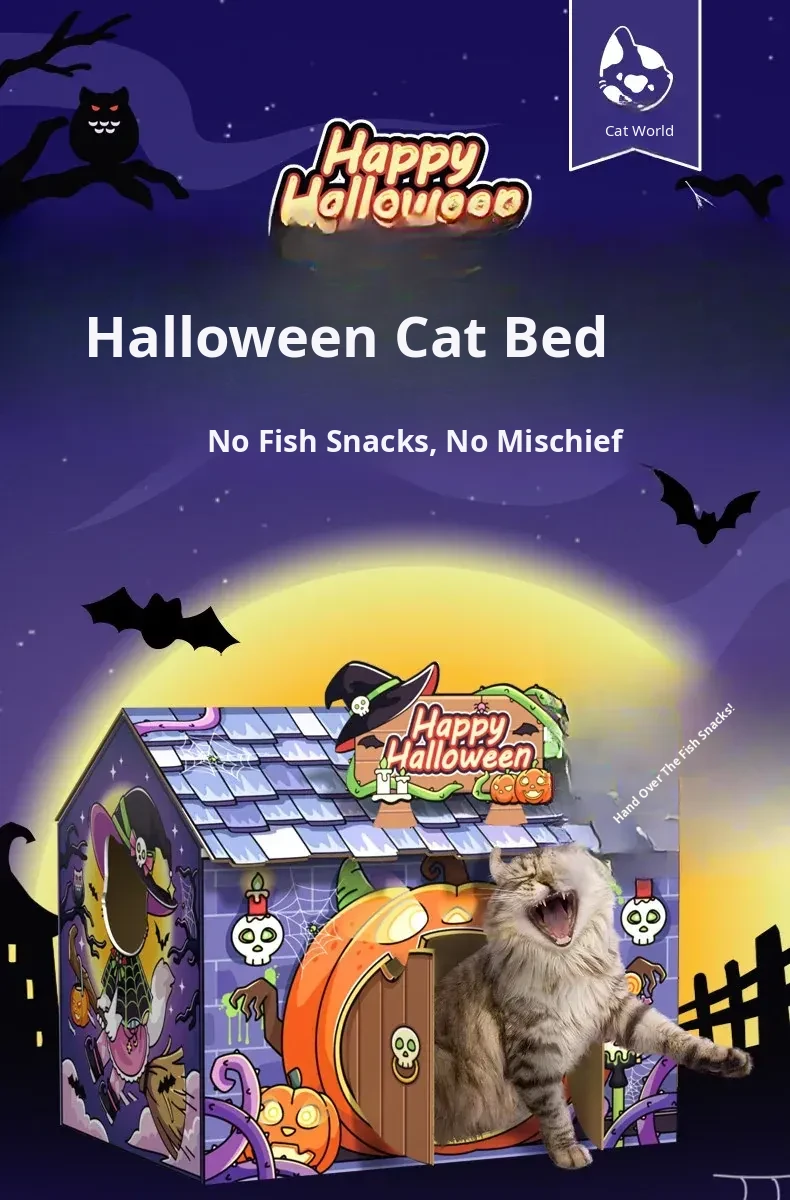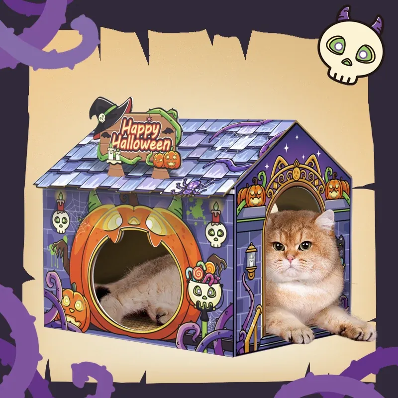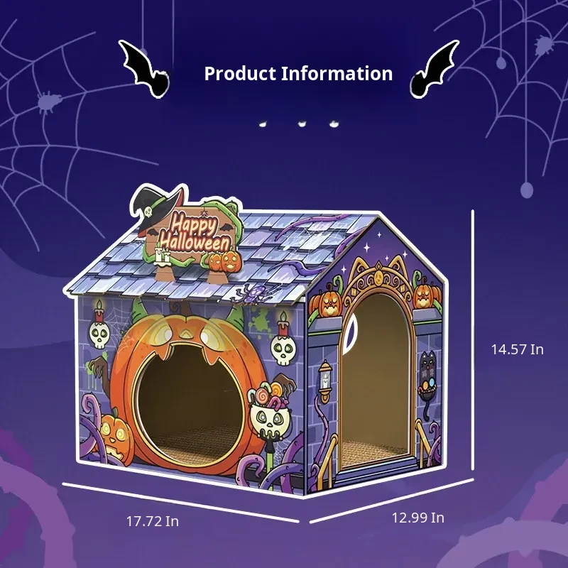 Halloween Cat House - Large Cat Scratching Post & Playhouse Combo, Durable Corrugated Cardboard Villa for Cats to Scratch and Play