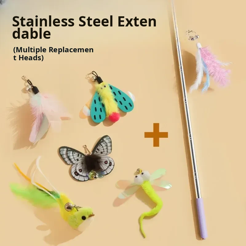 Retractable Cat Teaser Wand with Replaceable Heads - Durable Stainless Steel and Steel Wire with Feather Toy for Cats and Kittens - Engage Your Feline Friend in Endless Fun!