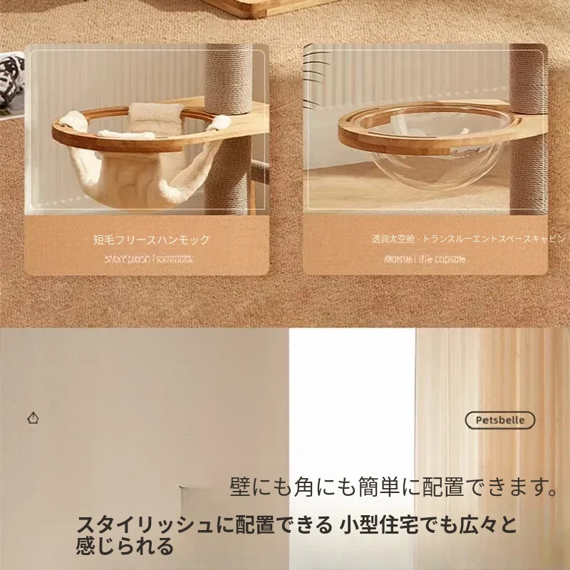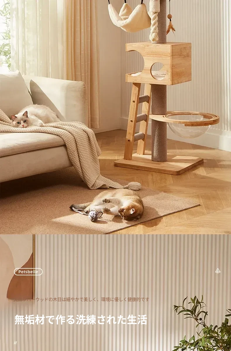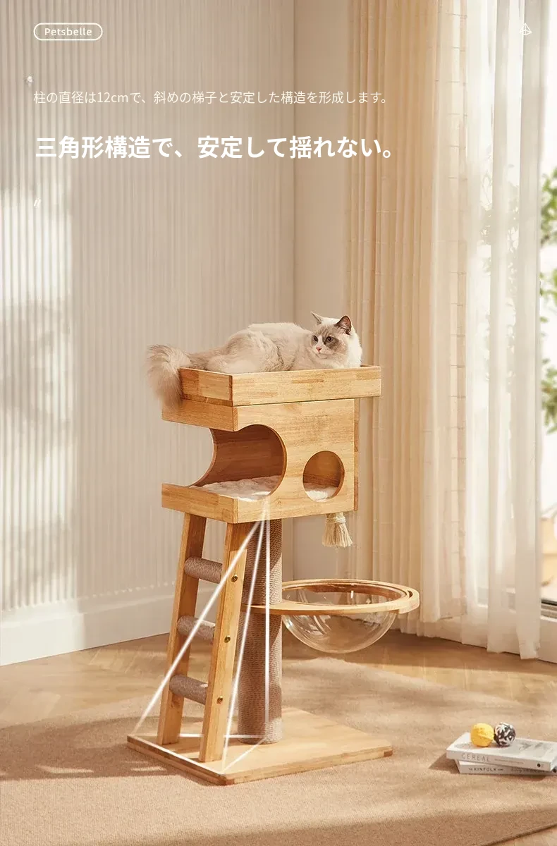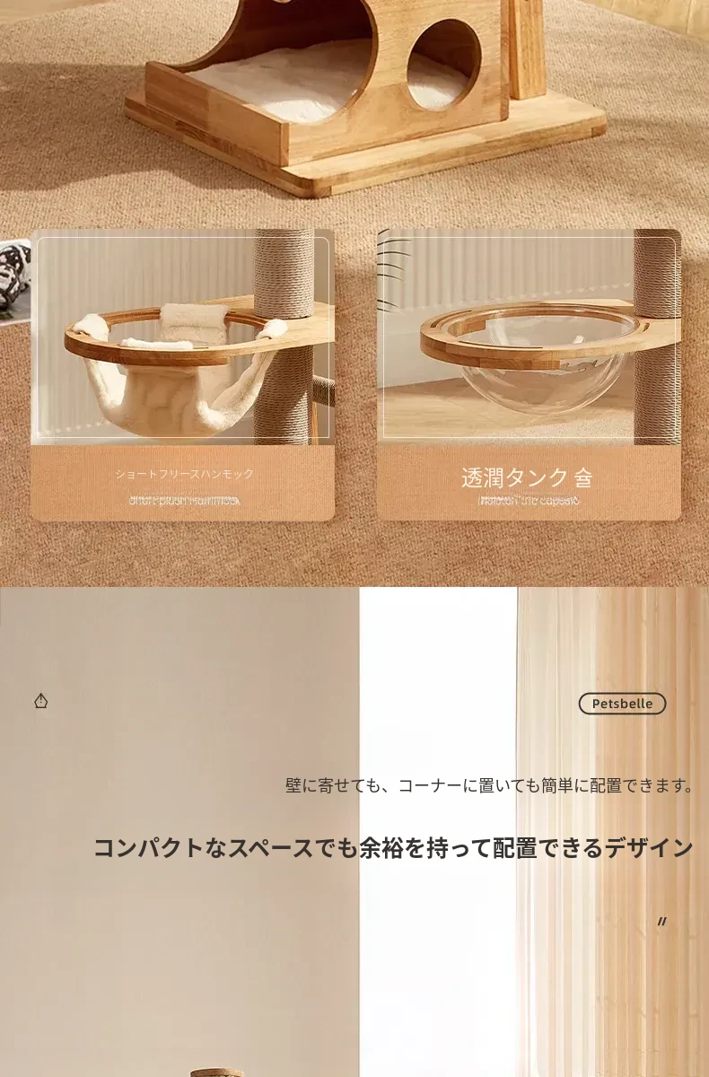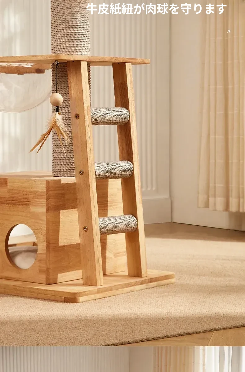 「獣牌メイジュウキャットタワー:省スペースのキャットハウス&キャットツリー一体型!おしゃれなデザインの木製キャットタワーで、愛猫の遊び場とくつろぎスペースを提供します。小型猫にぴったりのキャットクローラー付き!」
