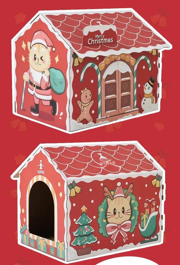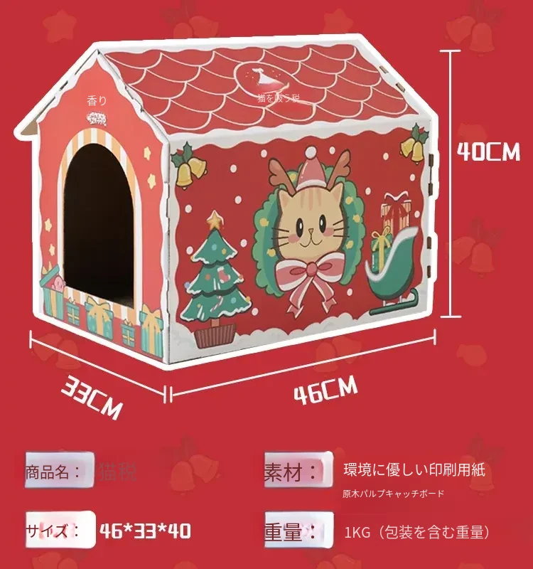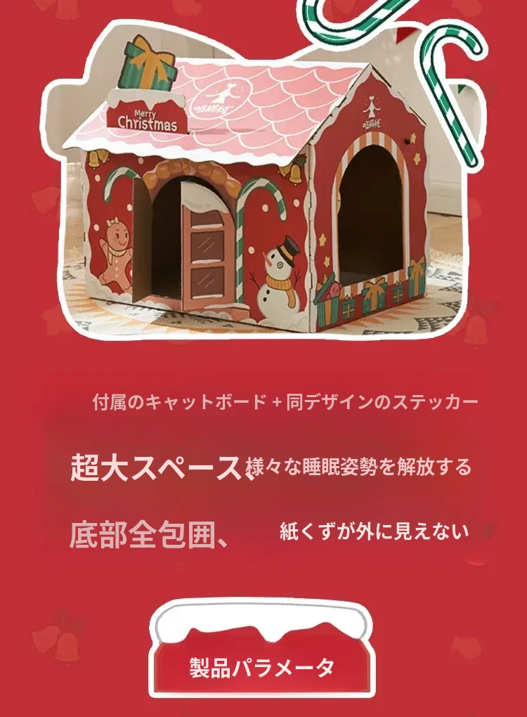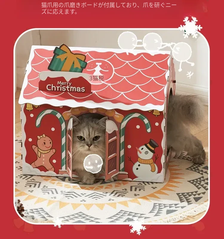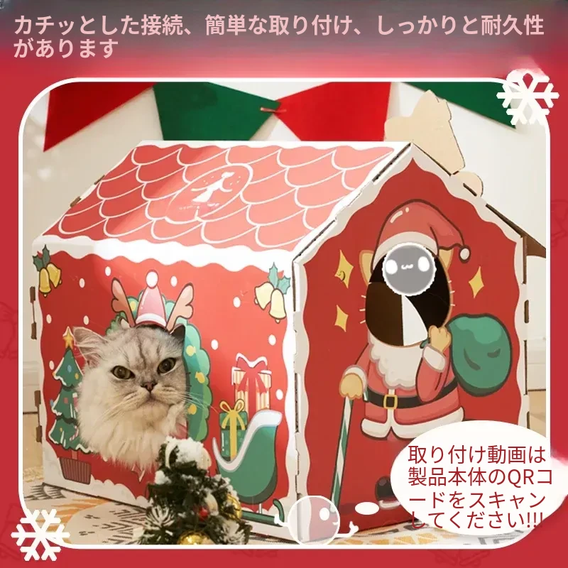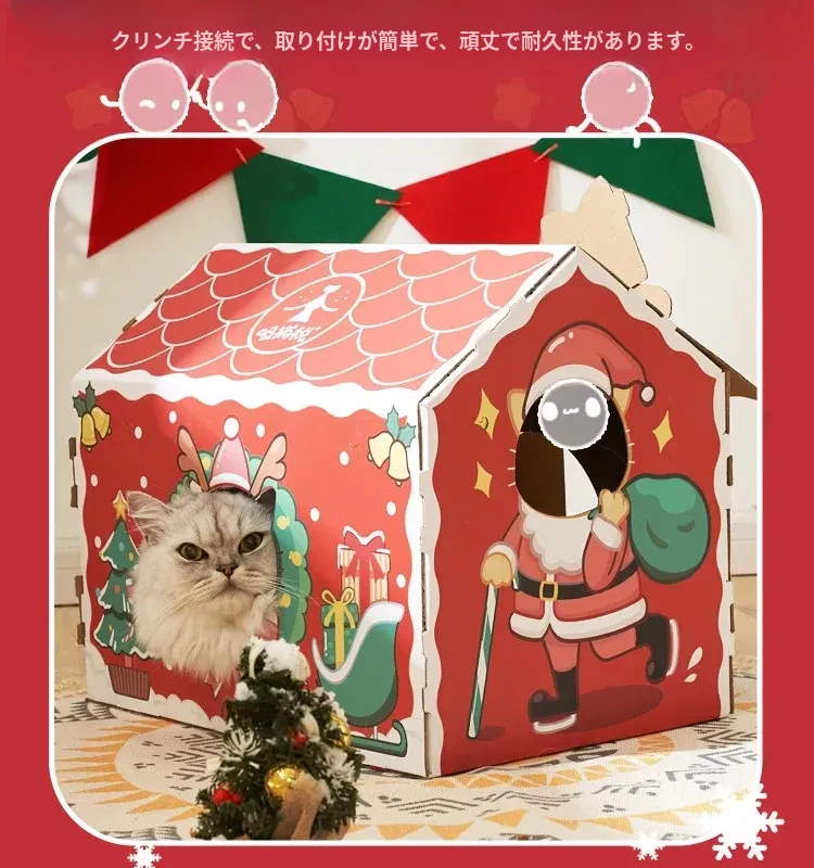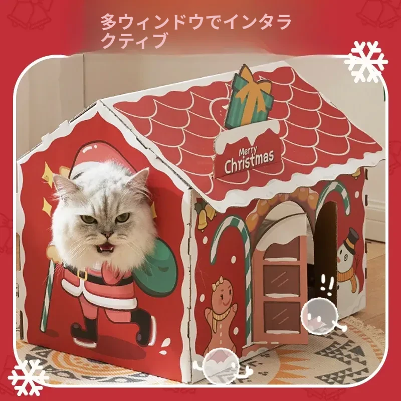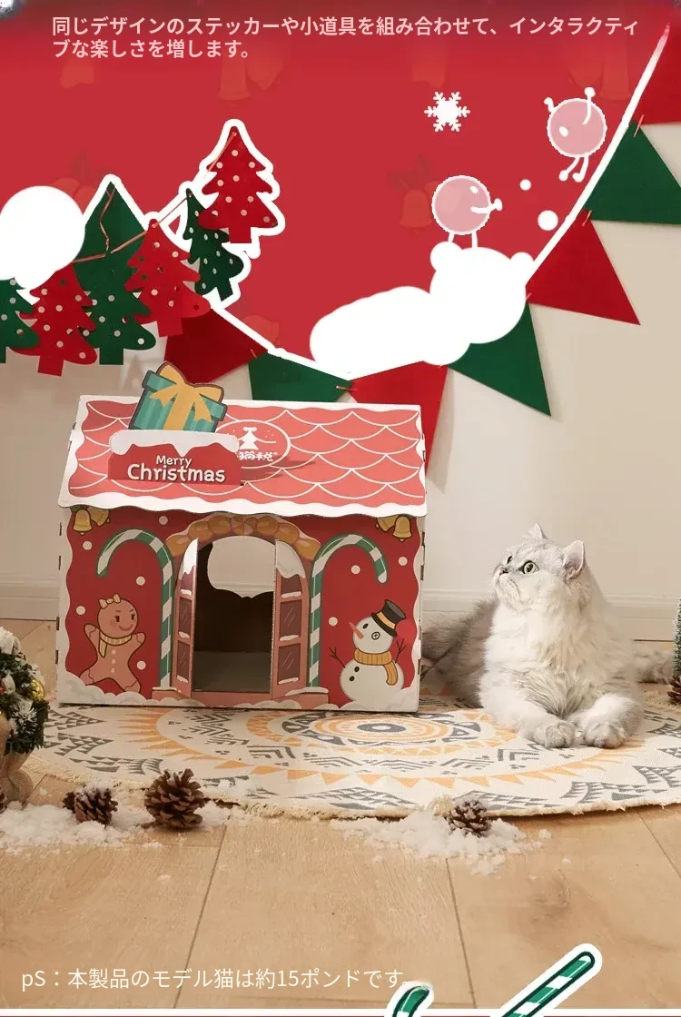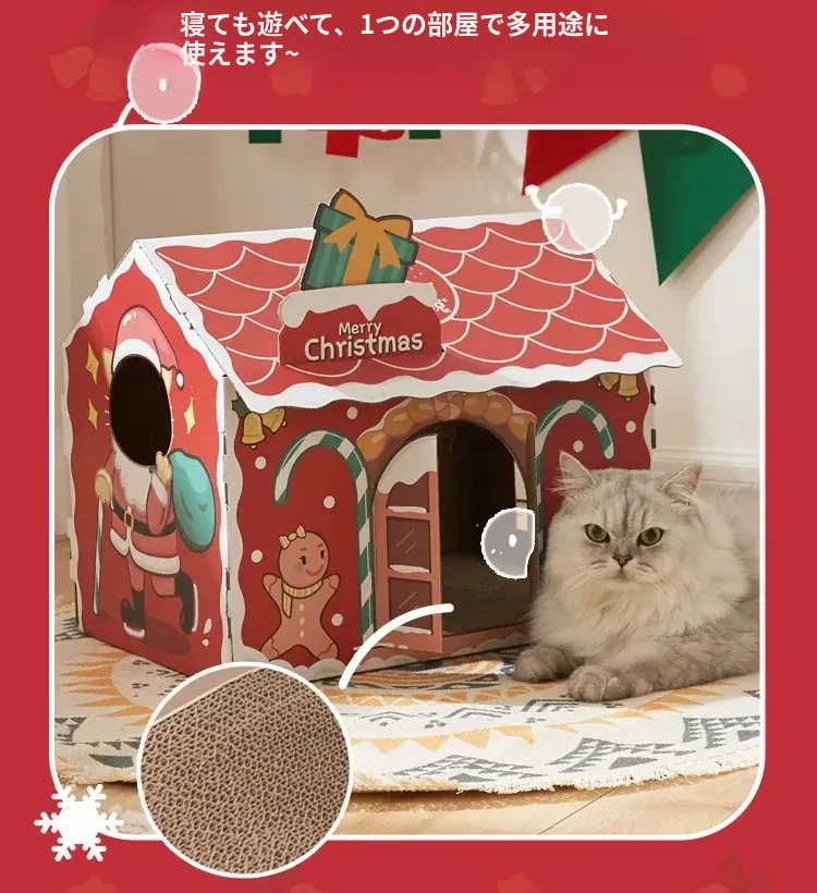 クリスマスキャットハウス兼キャットタワー!ダンボール製のスタンド式爪研ぎ器、四季通用の大サイズで、丈夫で猫ちゃんも大満足!快適な隠れ家と遊び場を提供します!