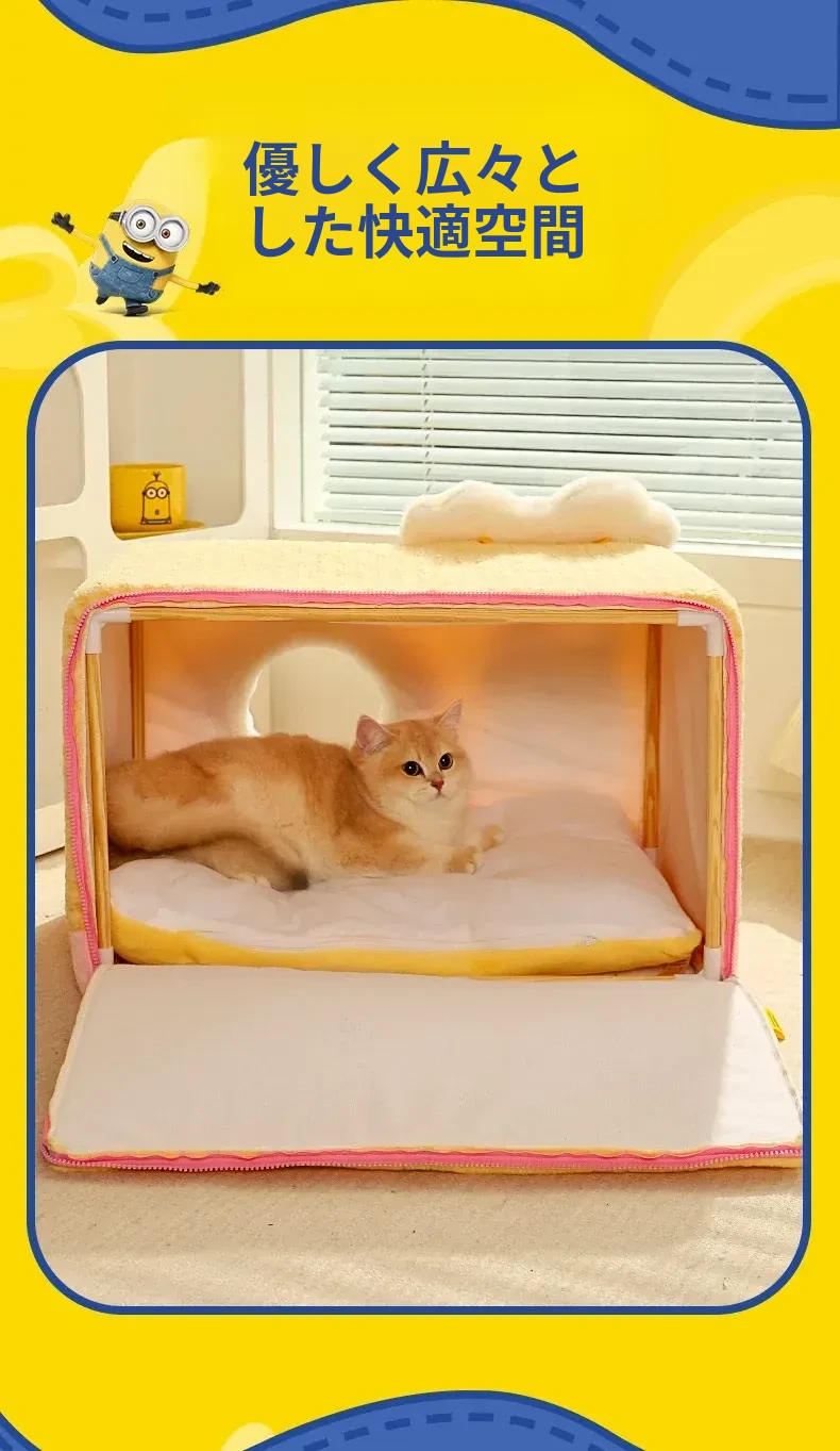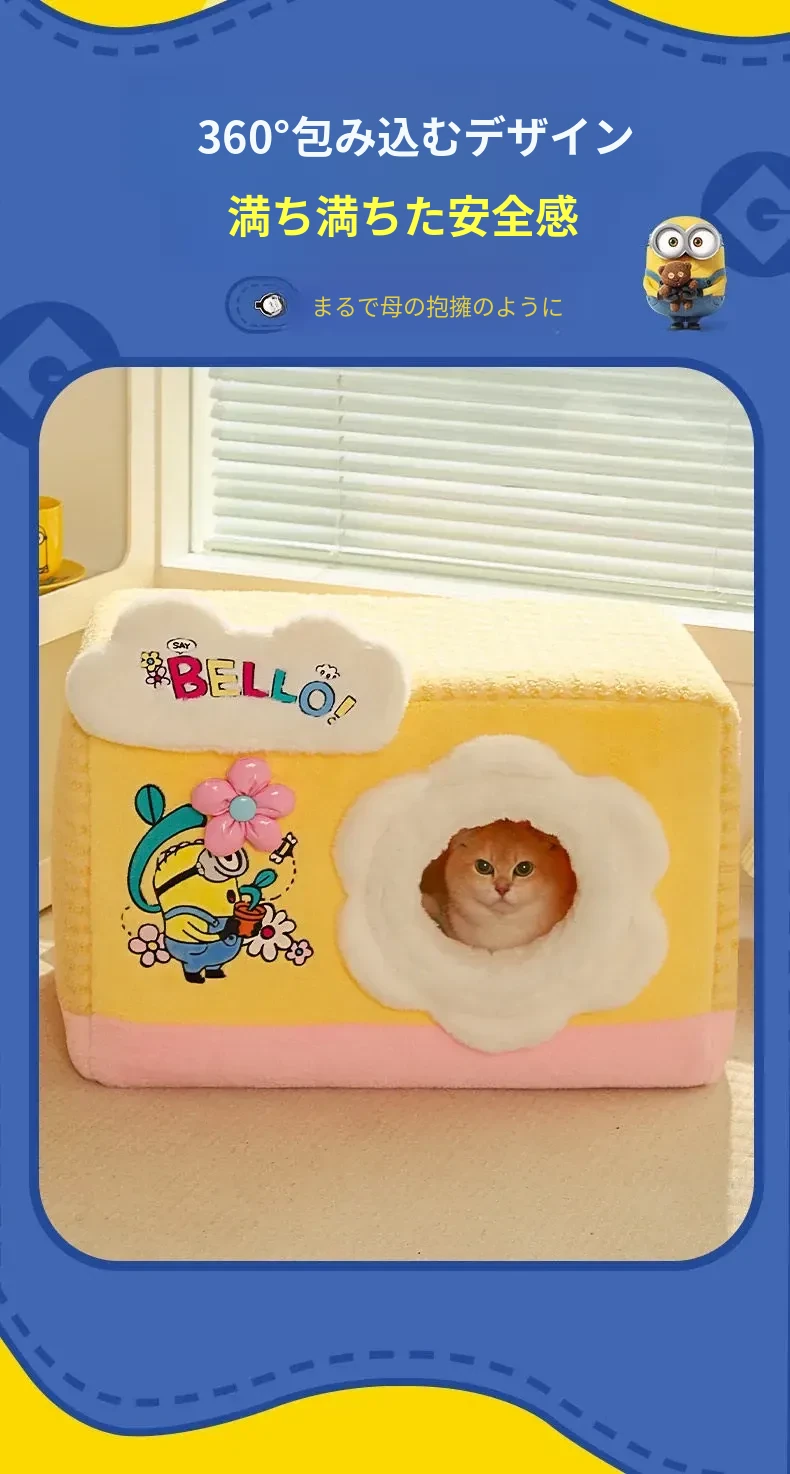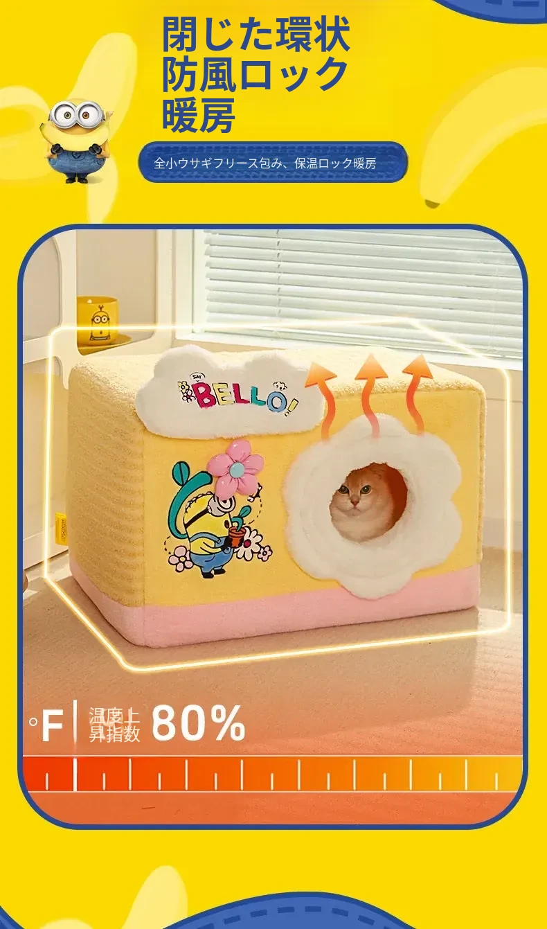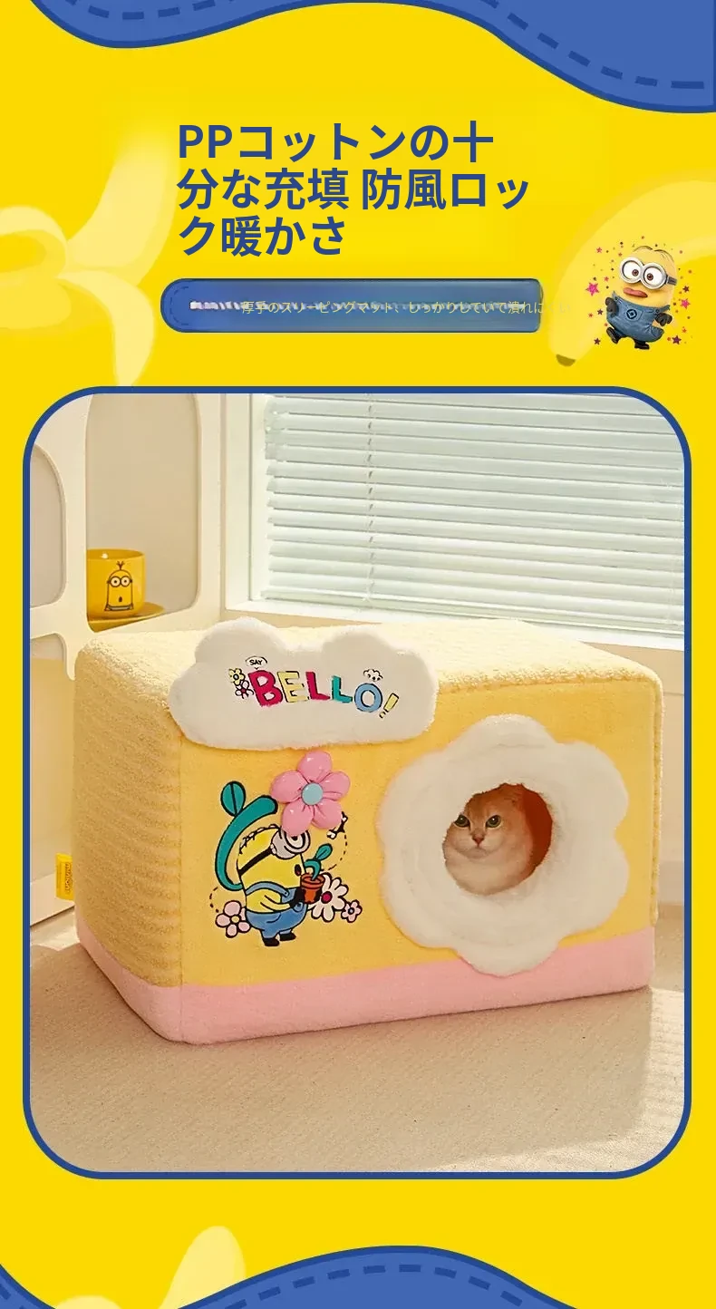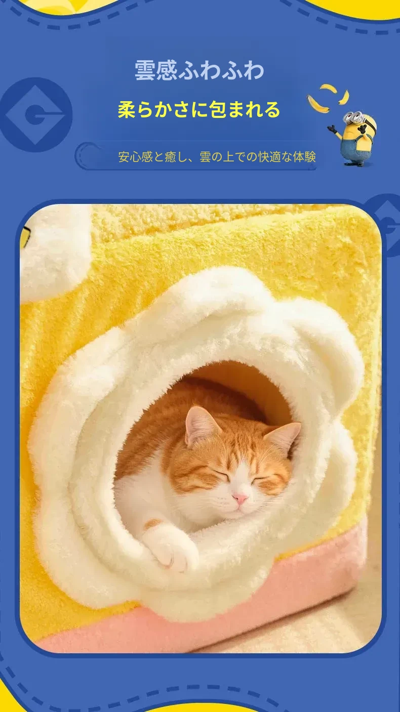 冬の寒さも怖くない!小黄人デザインの厚手封閉式キャットハウスで、子猫に安心感と温かさを提供。あなたの愛猫を守る快適な寝床、冬の必需品です!