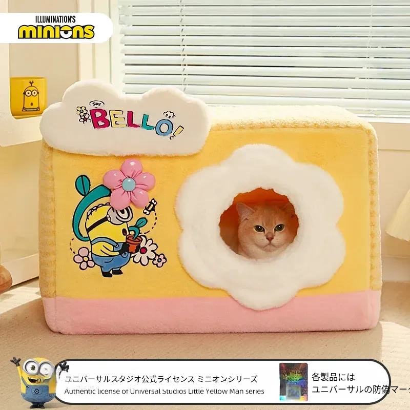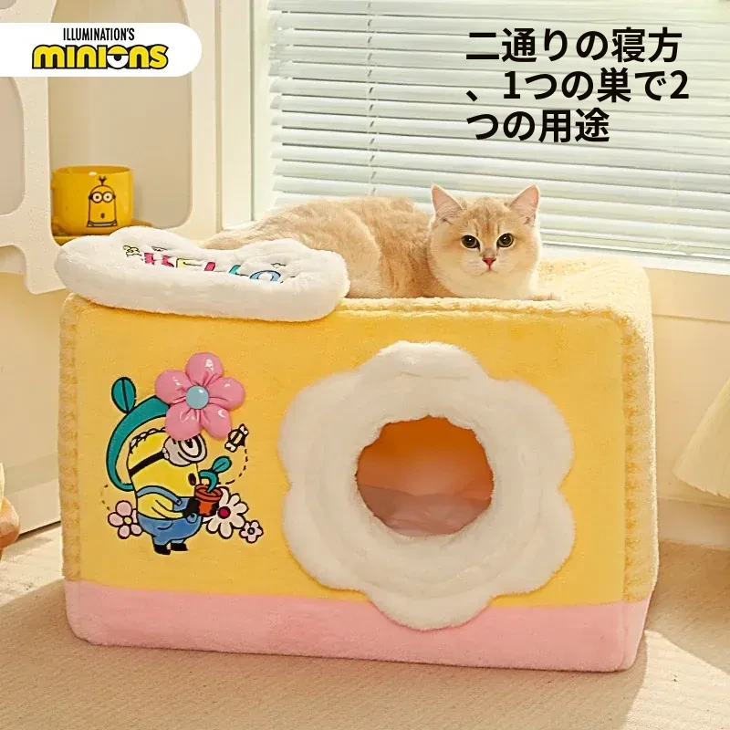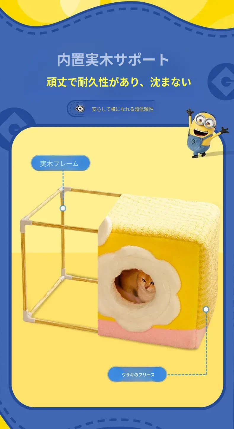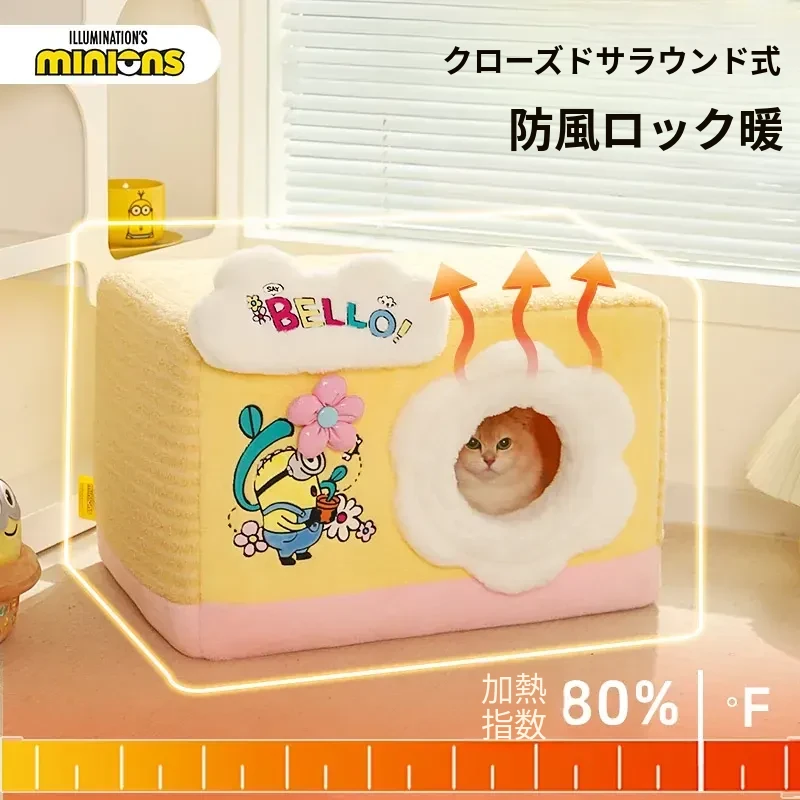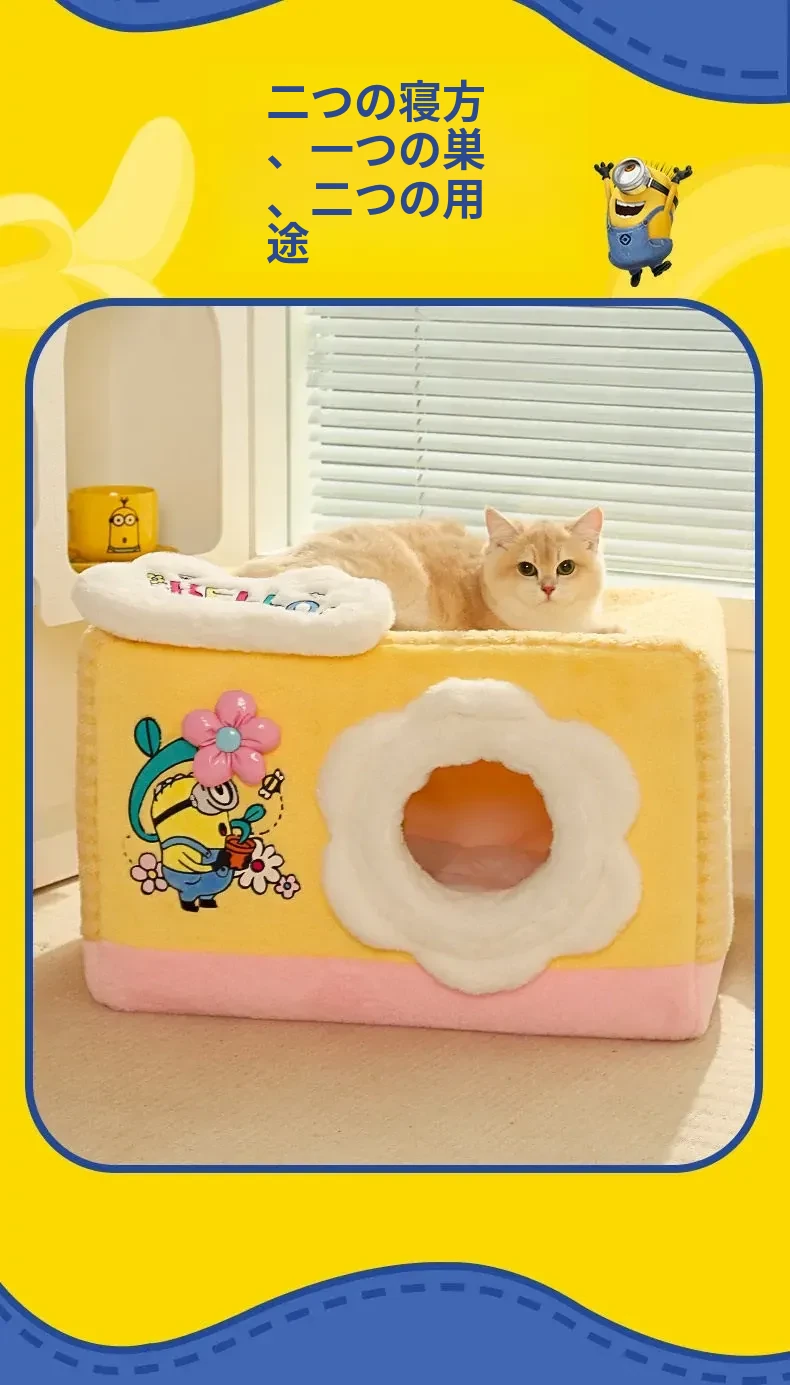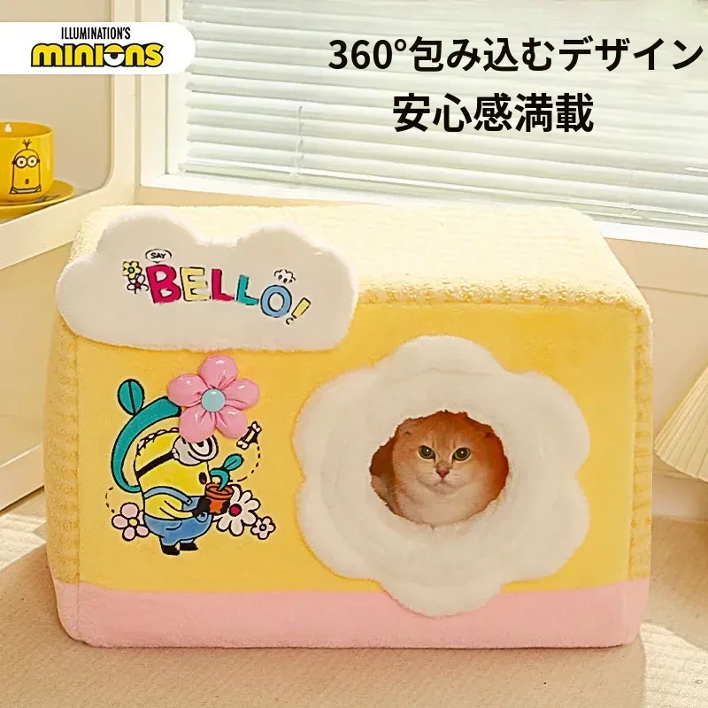 冬の寒さも怖くない!小黄人デザインの厚手封閉式キャットハウスで、子猫に安心感と温かさを提供。あなたの愛猫を守る快適な寝床、冬の必需品です!