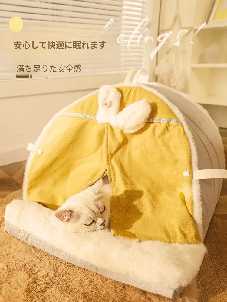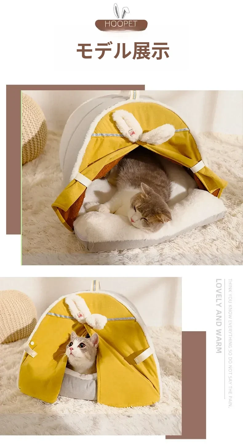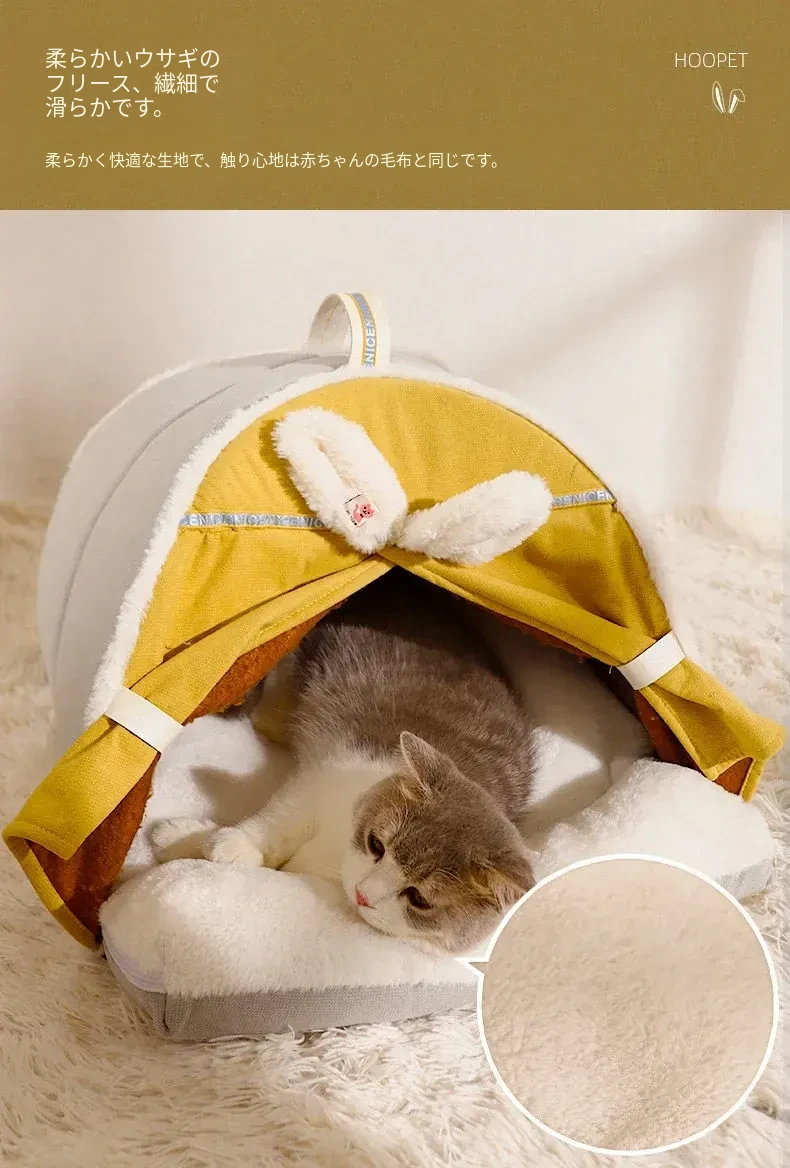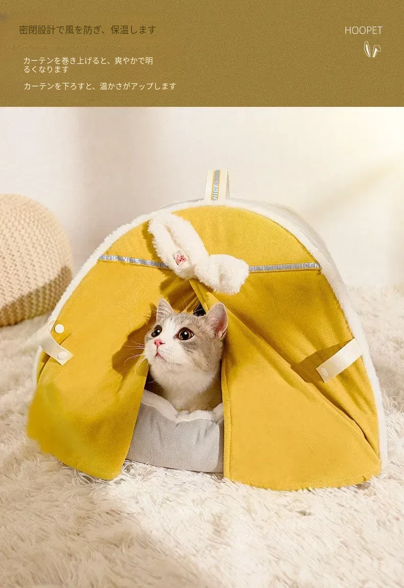 ペット用フリース付きテント型キャットハウス(クリームイエロー)