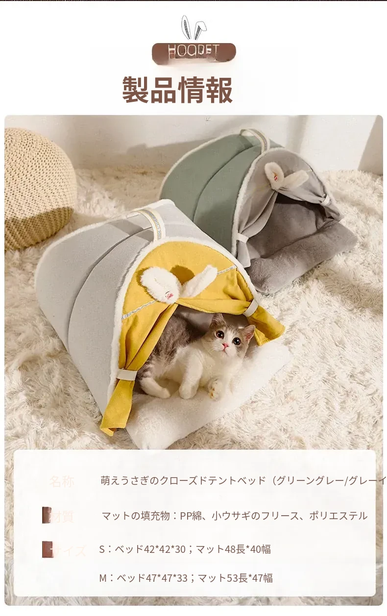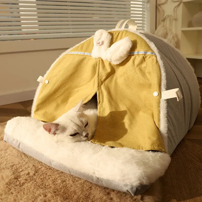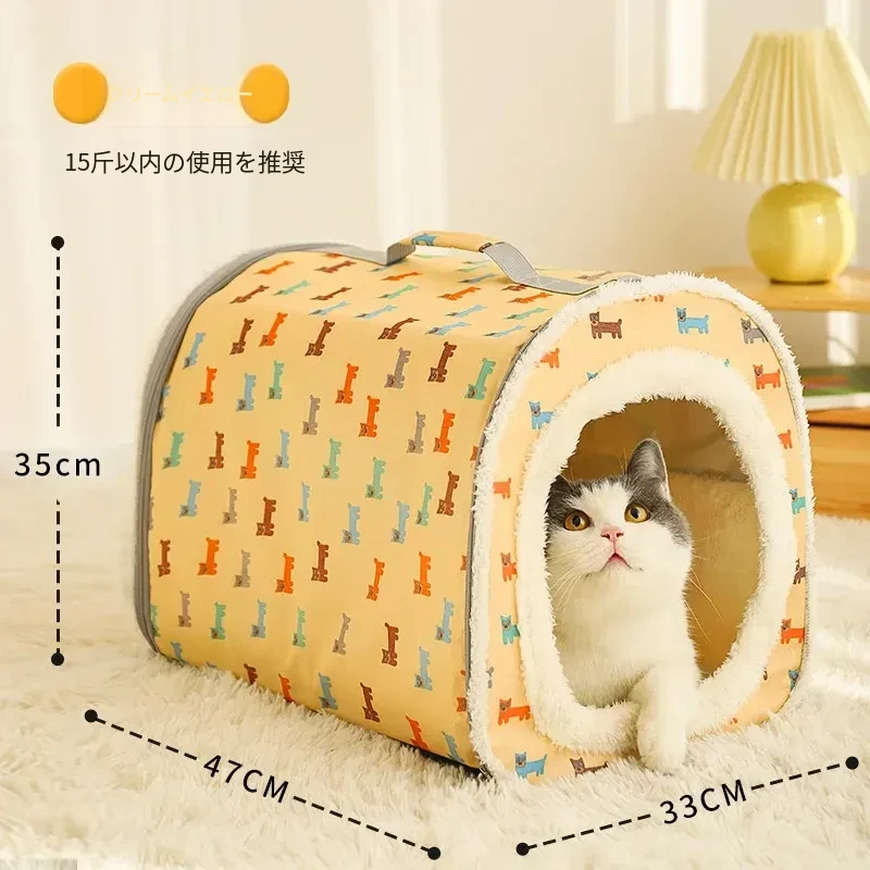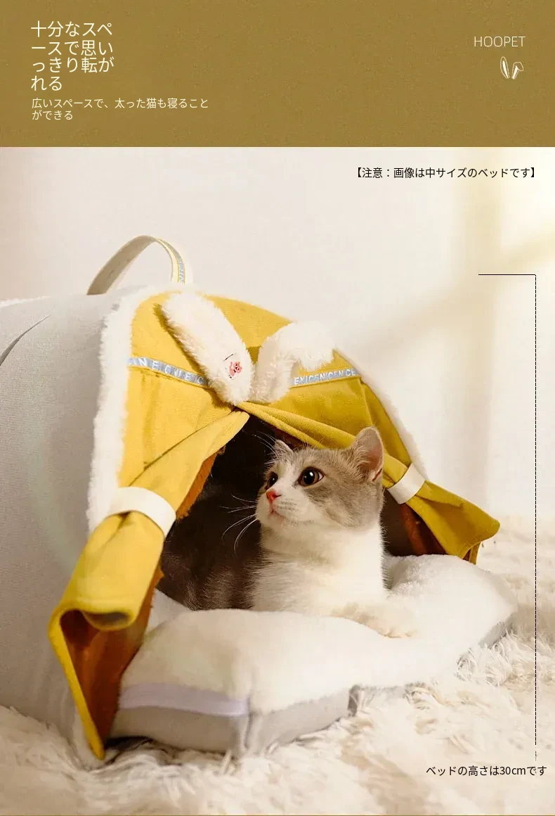 ペット用フリース付きテント型キャットハウス(クリームイエロー)