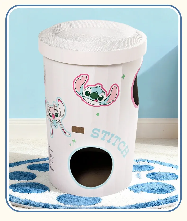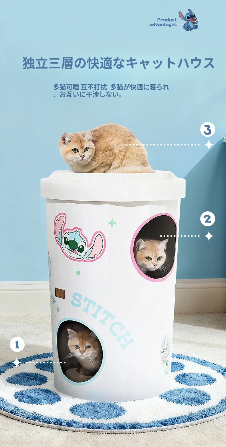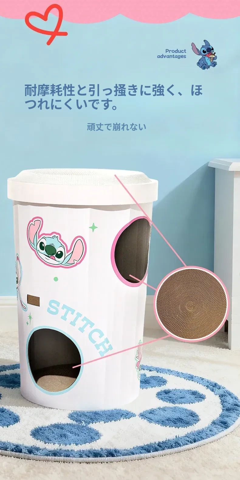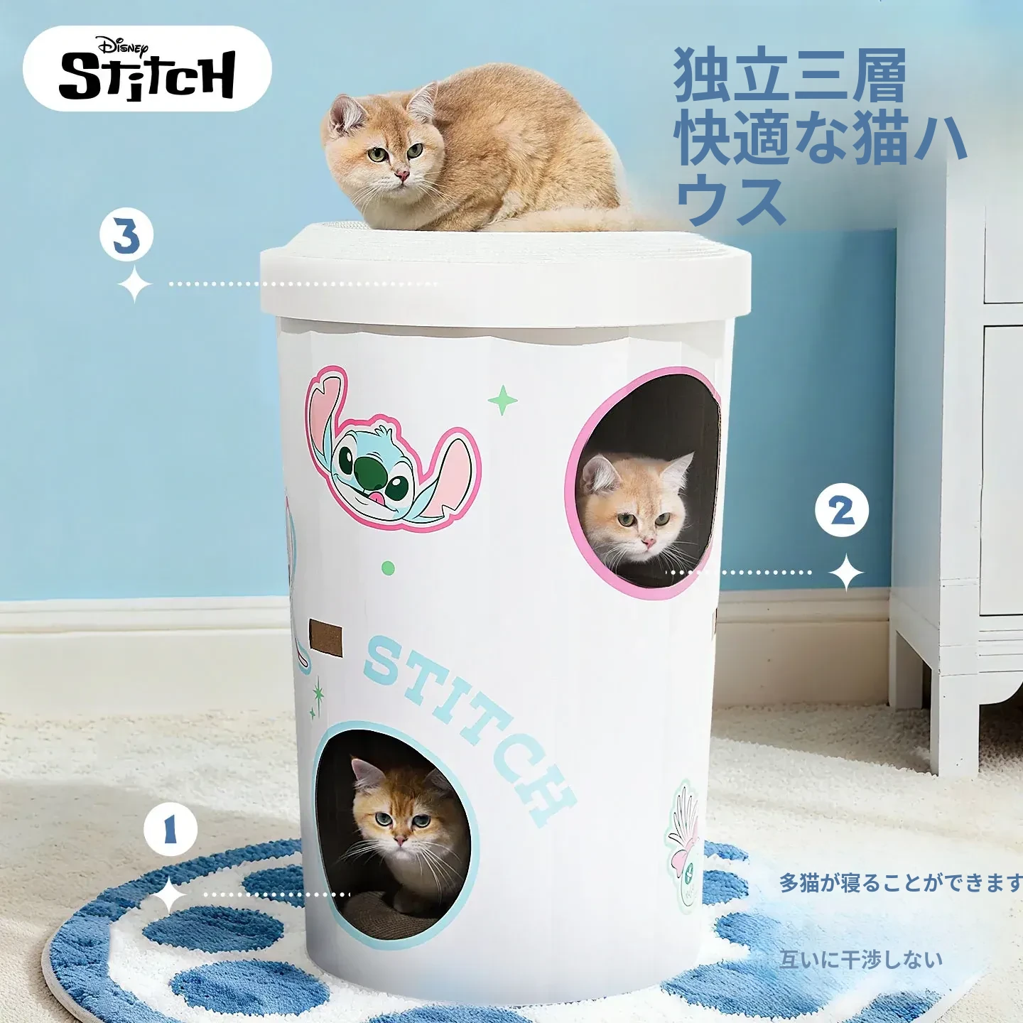ディズニースティッチシリーズ スティッチキャットグラブトンネル 猫型キャットハウス一体型キャットタワー スティッチ多層ミルクティーバケツで、愛猫の遊びとリラックスを実現!