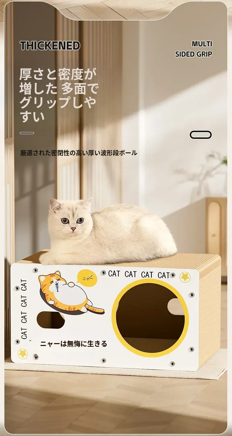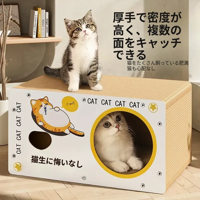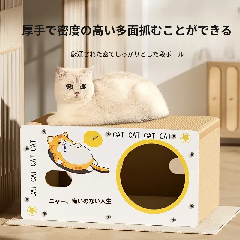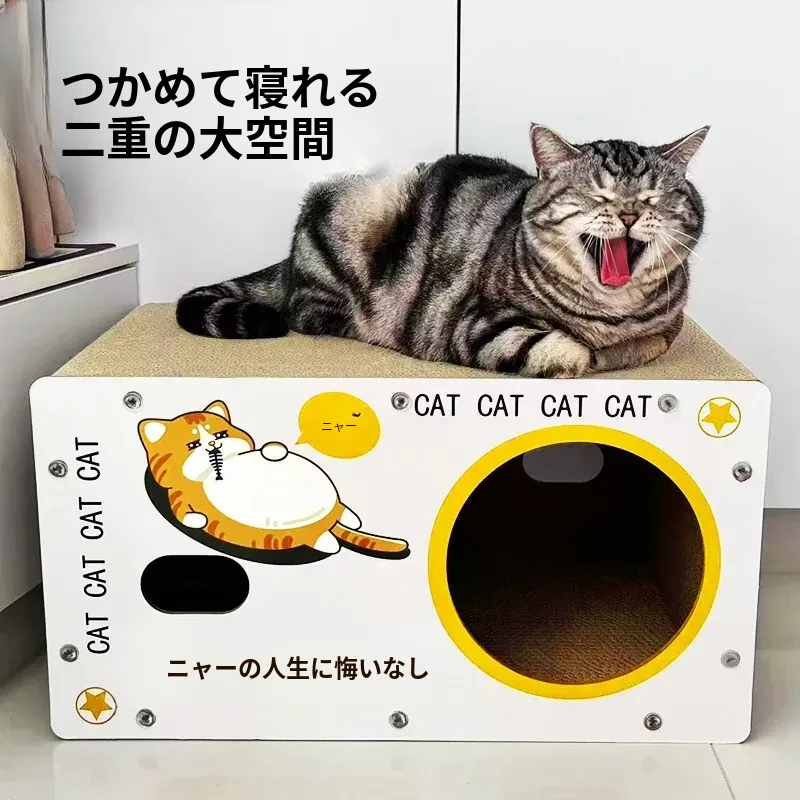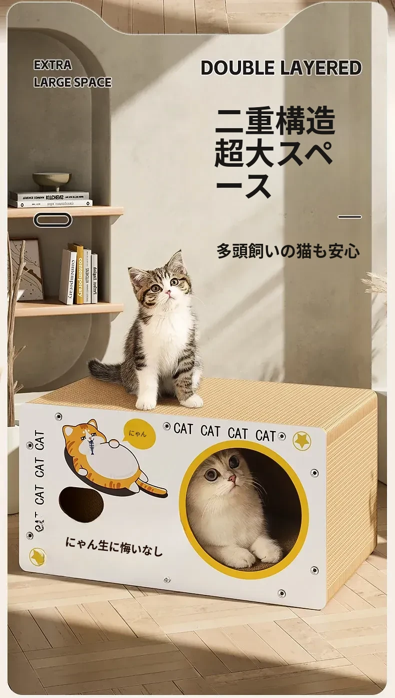 耐久性抜群!ダブルレイヤーの段ボールキャットハウス&爪研ぎボード - 大型猫に最適な、毛が抜けない猫用ベッド!快適で遊び心満載、愛猫にぴったりのアイテムです!