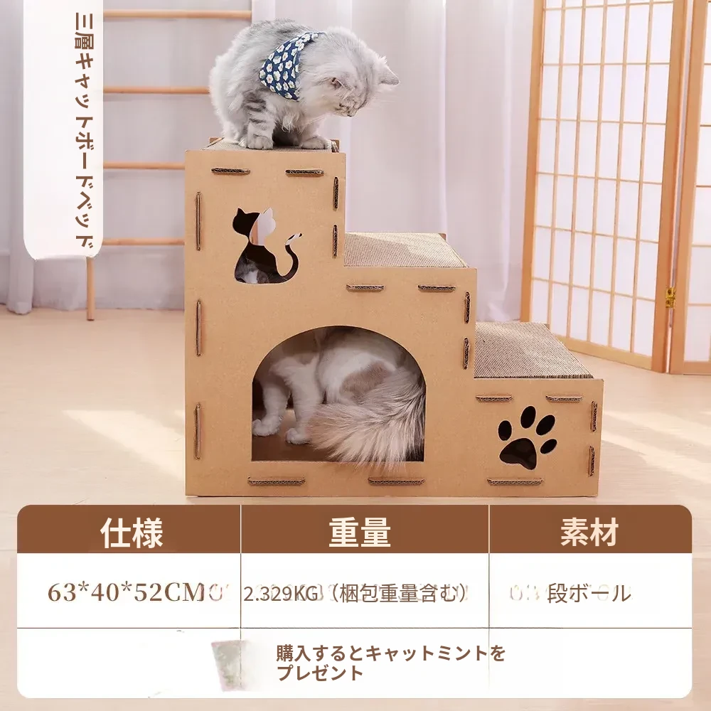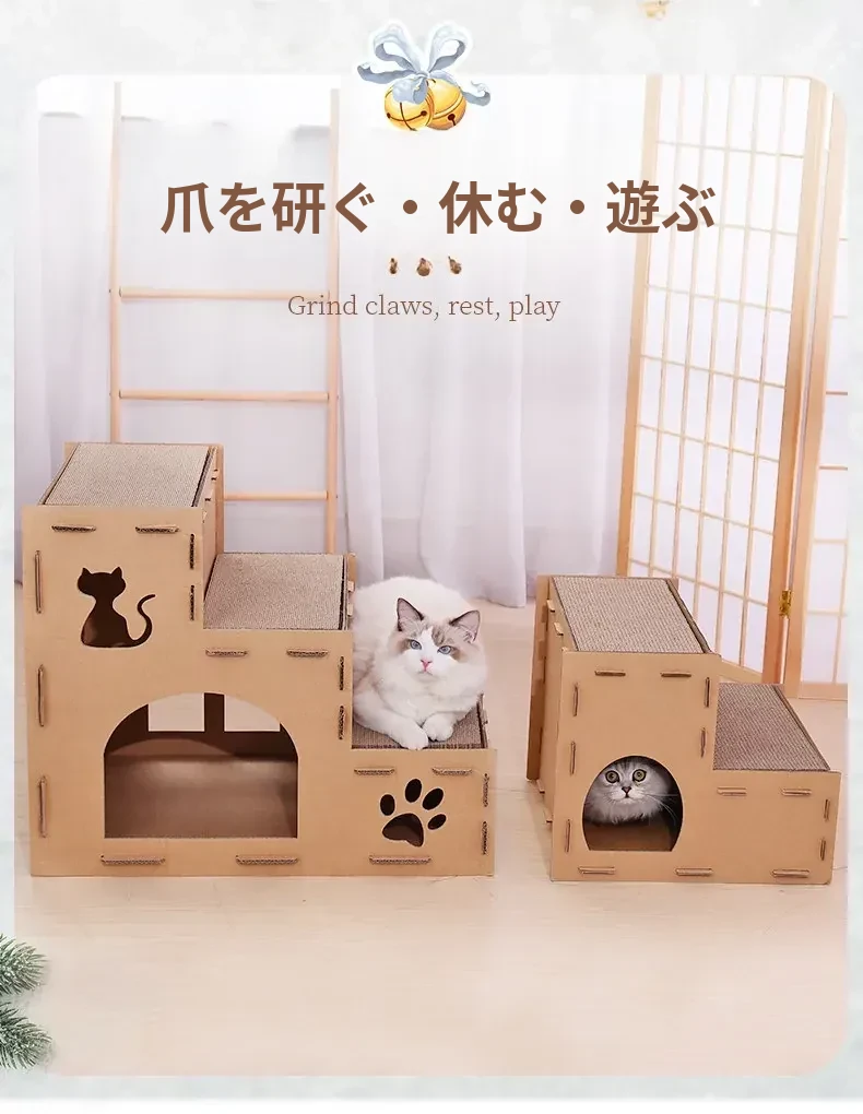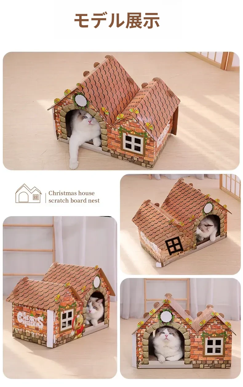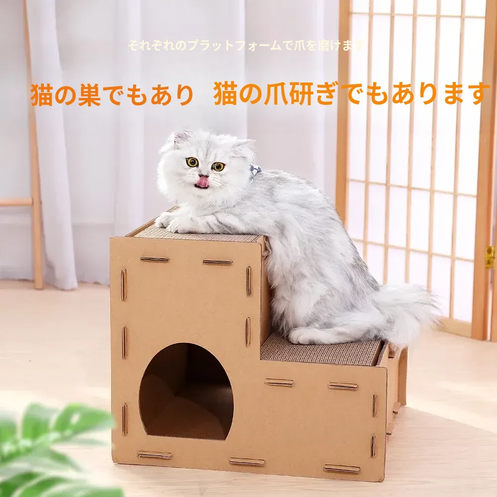 段ボール製キャットハウス&爪研ぎボード一体型!特大サイズで快適な猫の隠れ家、遊びとリラックスの完璧な場所。おしゃれで実用的な猫用品。あなたの愛猫に最適なビラ!