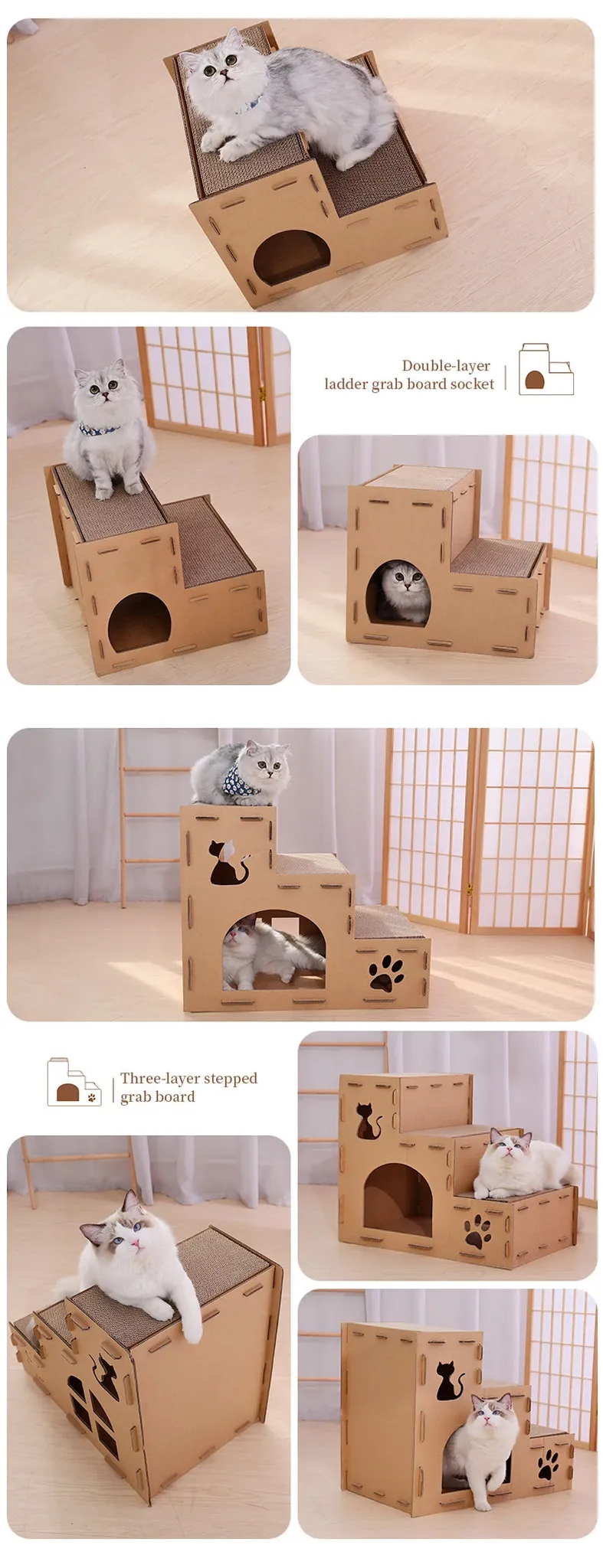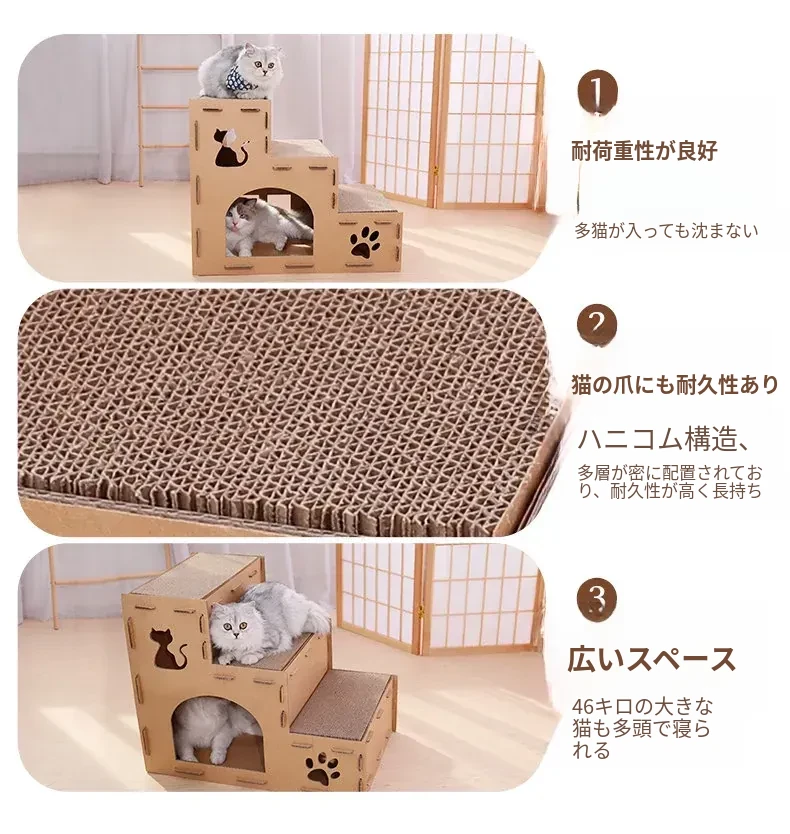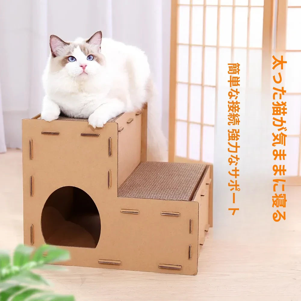 段ボール製キャットハウス&爪研ぎボード一体型!特大サイズで快適な猫の隠れ家、遊びとリラックスの完璧な場所。おしゃれで実用的な猫用品。あなたの愛猫に最適なビラ!