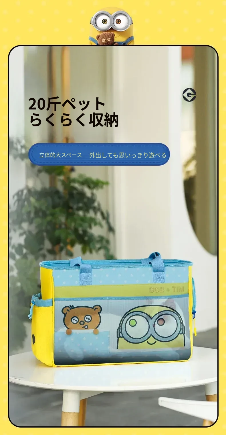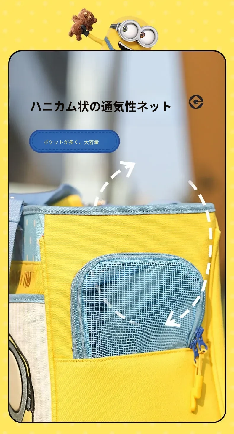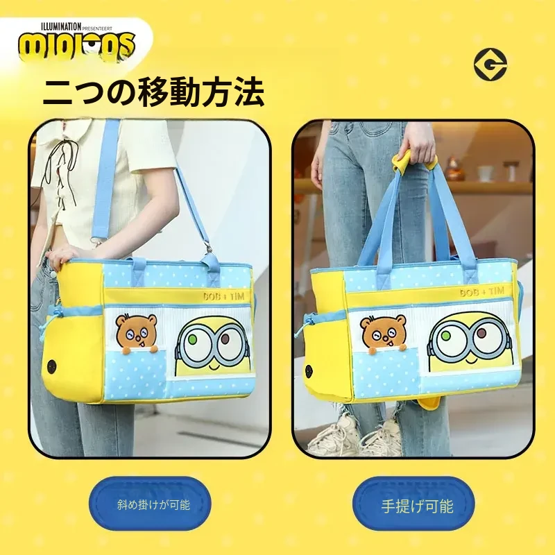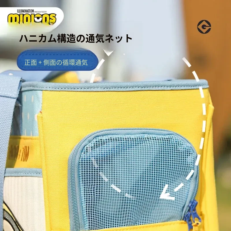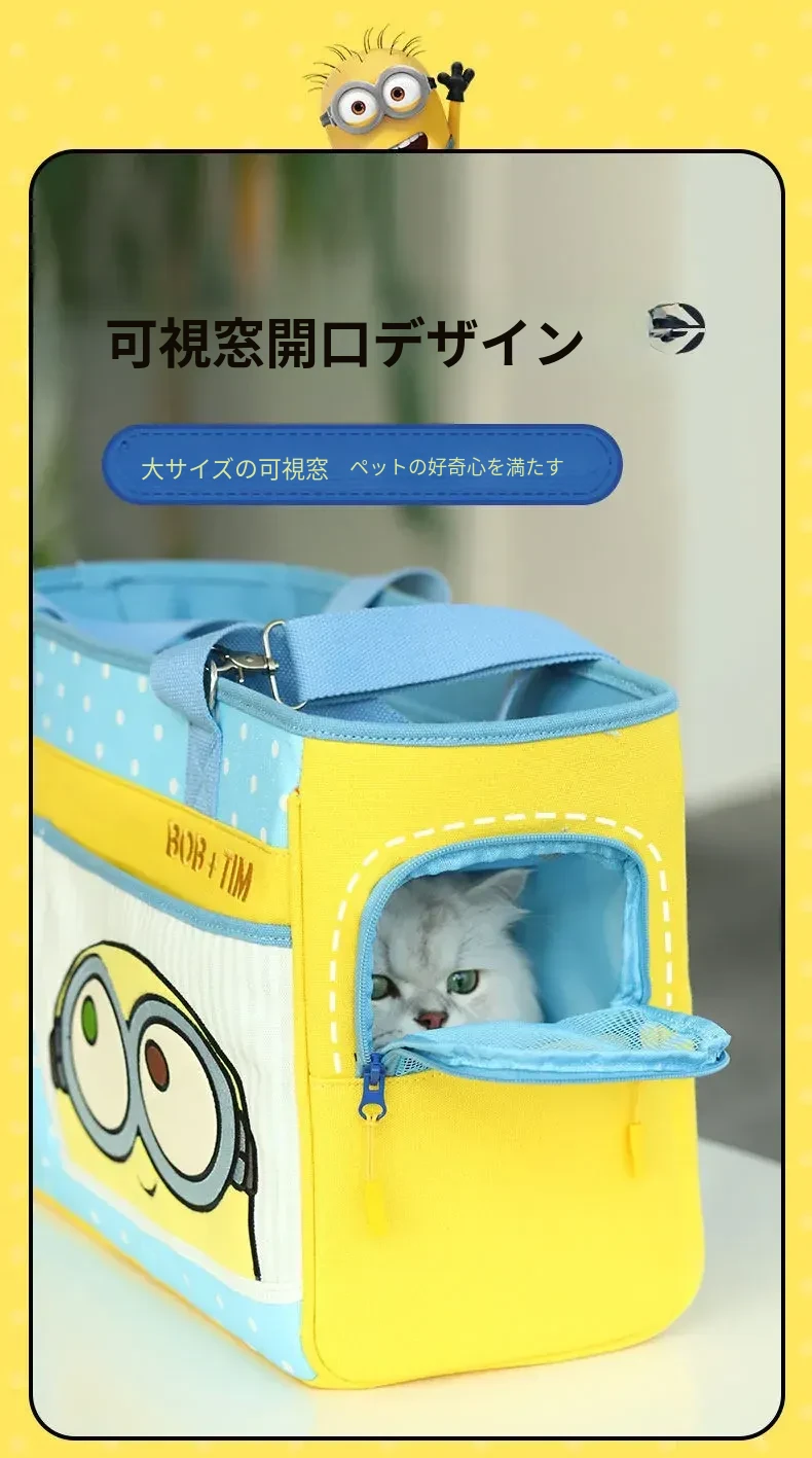 ミニオンコラボの猫用外出バッグ!ペットキャリーリュック、ストレス軽減設計で安心してお出かけ。手提げ・斜め掛け両用、可愛いデザインで愛猫とのお散歩が楽しくなる!