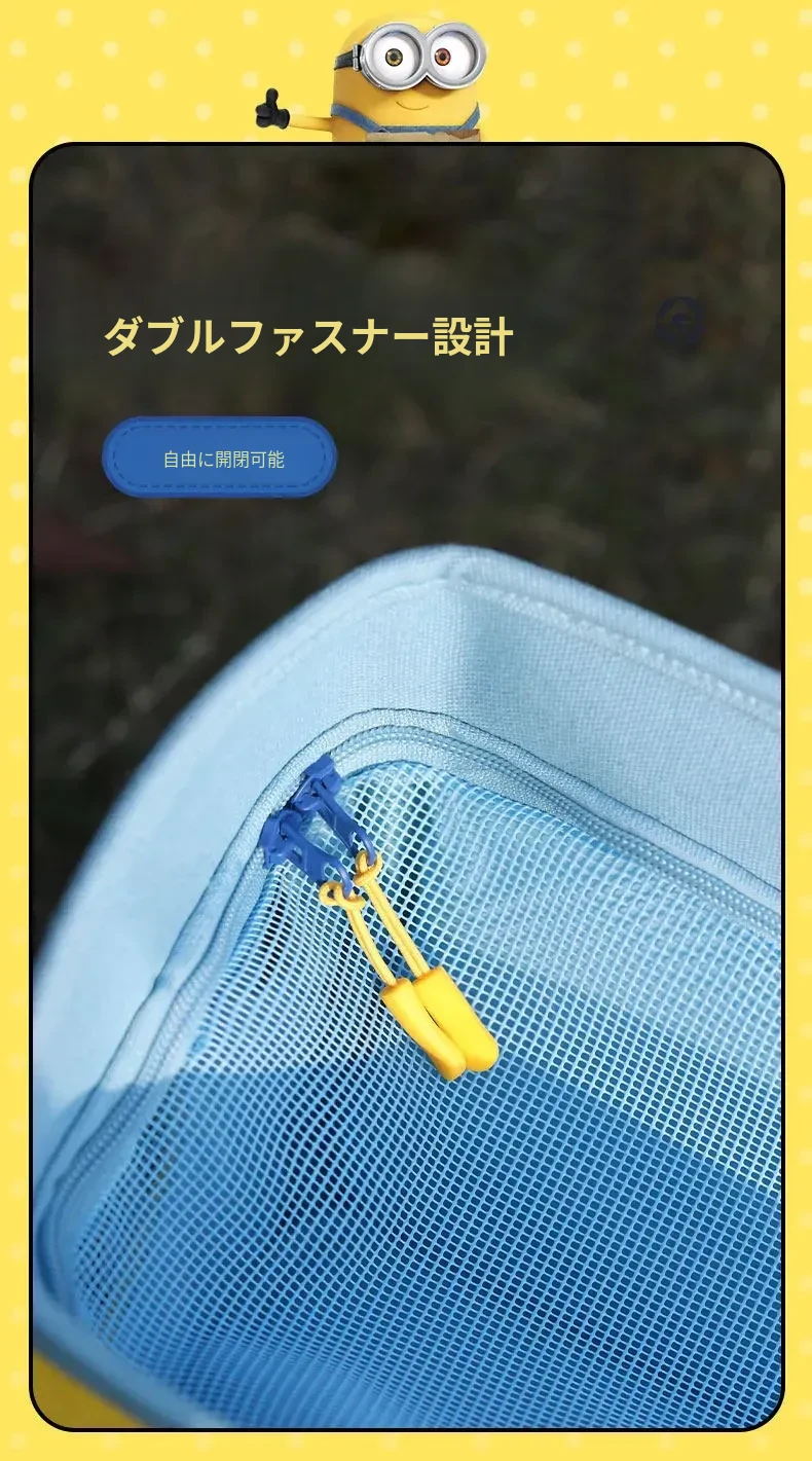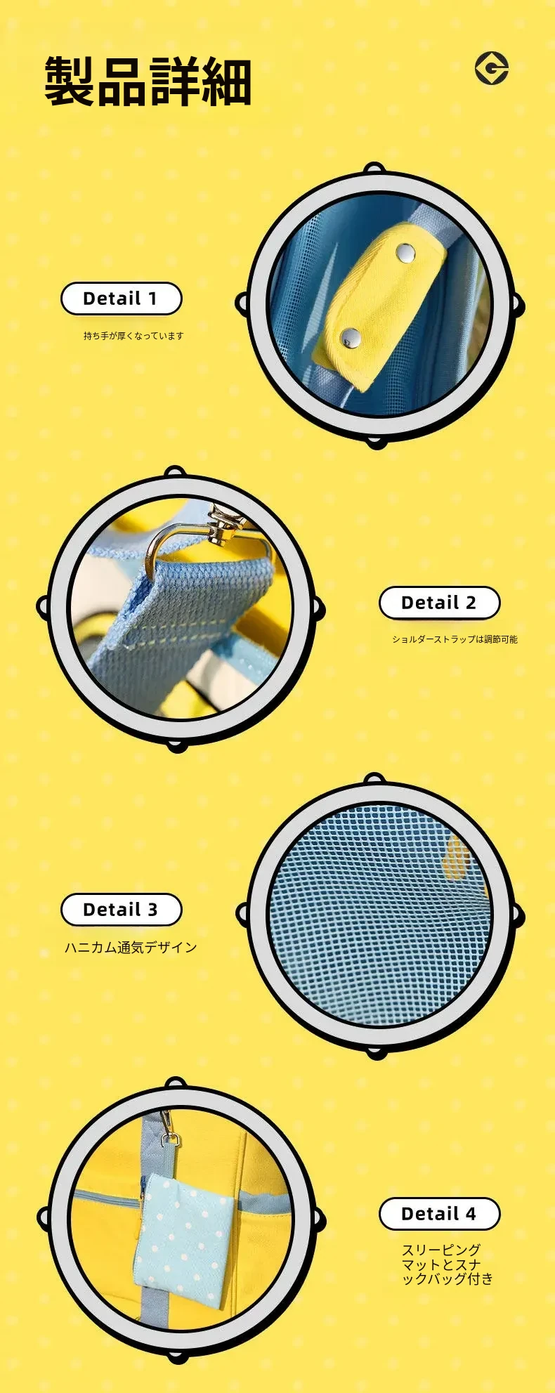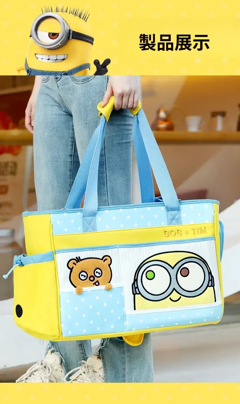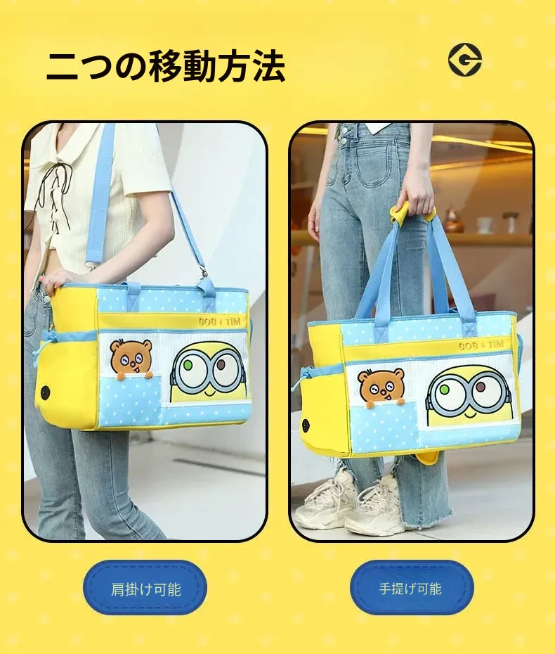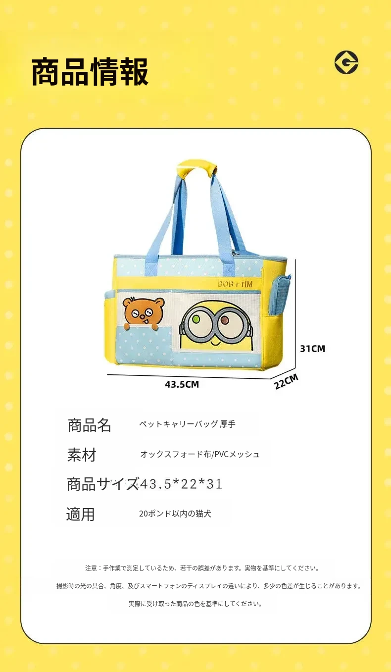 ミニオンコラボの猫用外出バッグ!ペットキャリーリュック、ストレス軽減設計で安心してお出かけ。手提げ・斜め掛け両用、可愛いデザインで愛猫とのお散歩が楽しくなる!