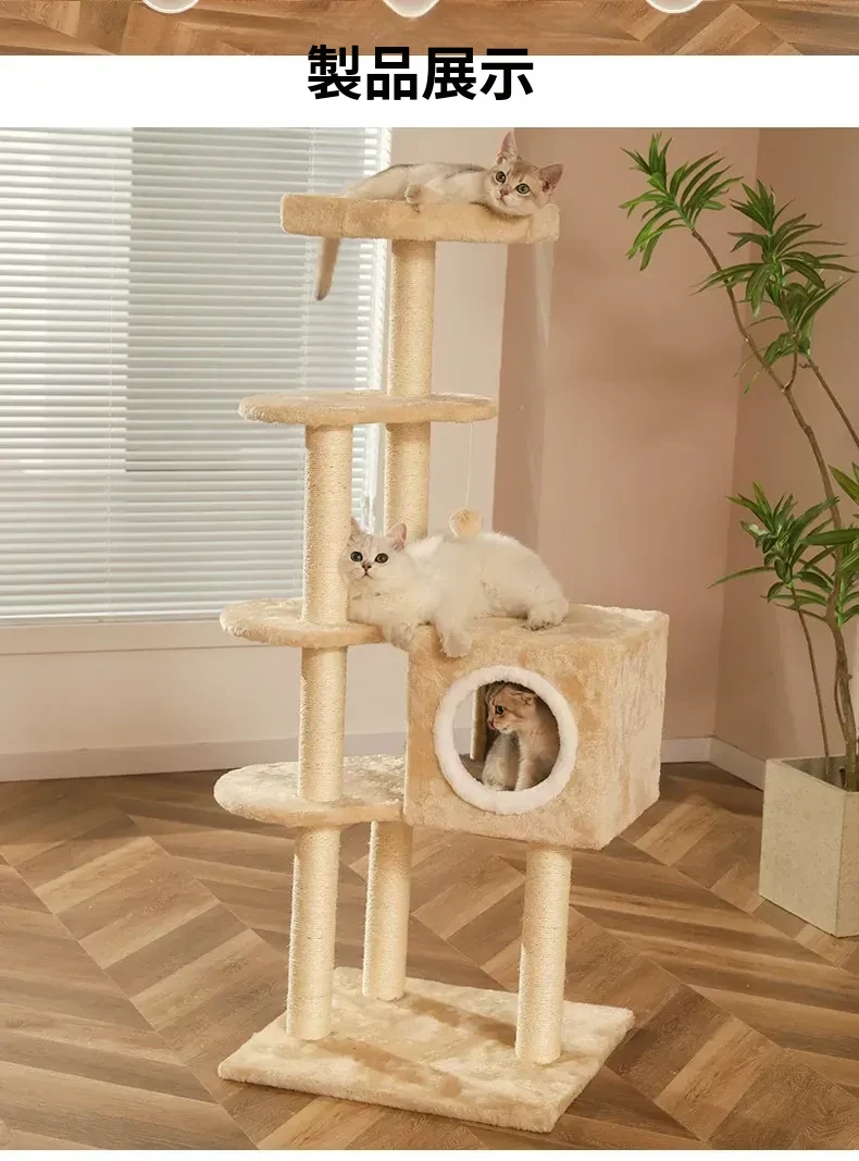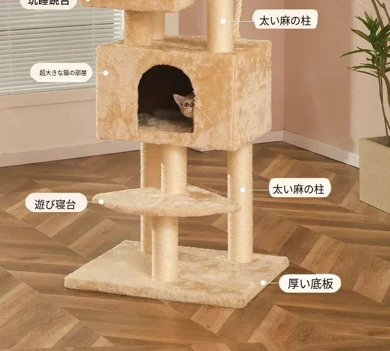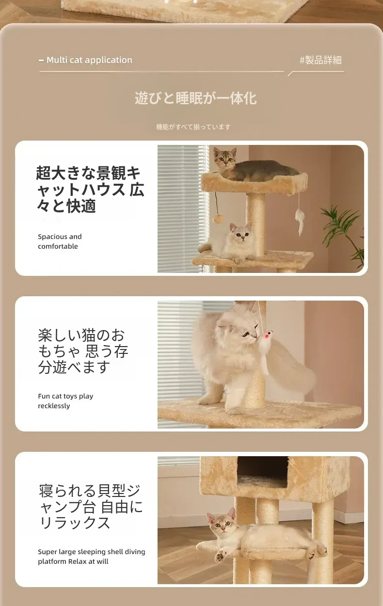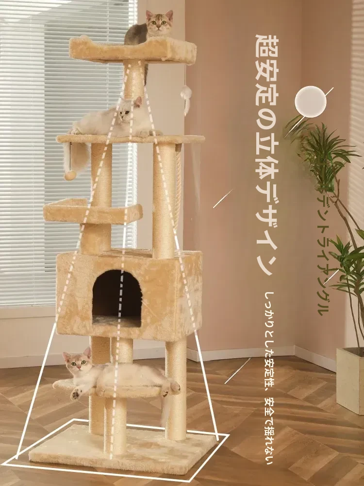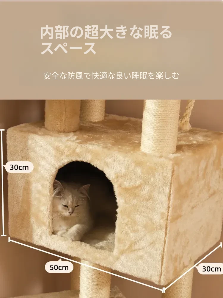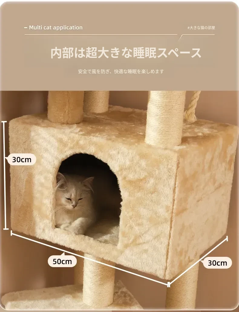 キャットタワー&キャットハウス一体型!おしゃれで機能的な大容量キャットツリー、愛猫のための快適な遊び場。高い爪研ぎポール付きで、元気な猫ちゃんも大満足!家庭用に最適な大型キャットフレームです。