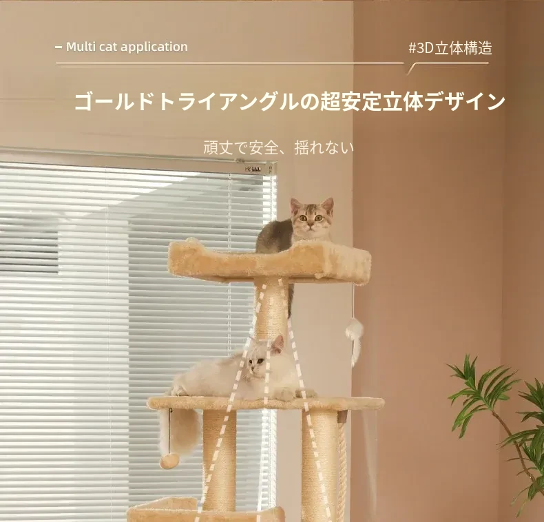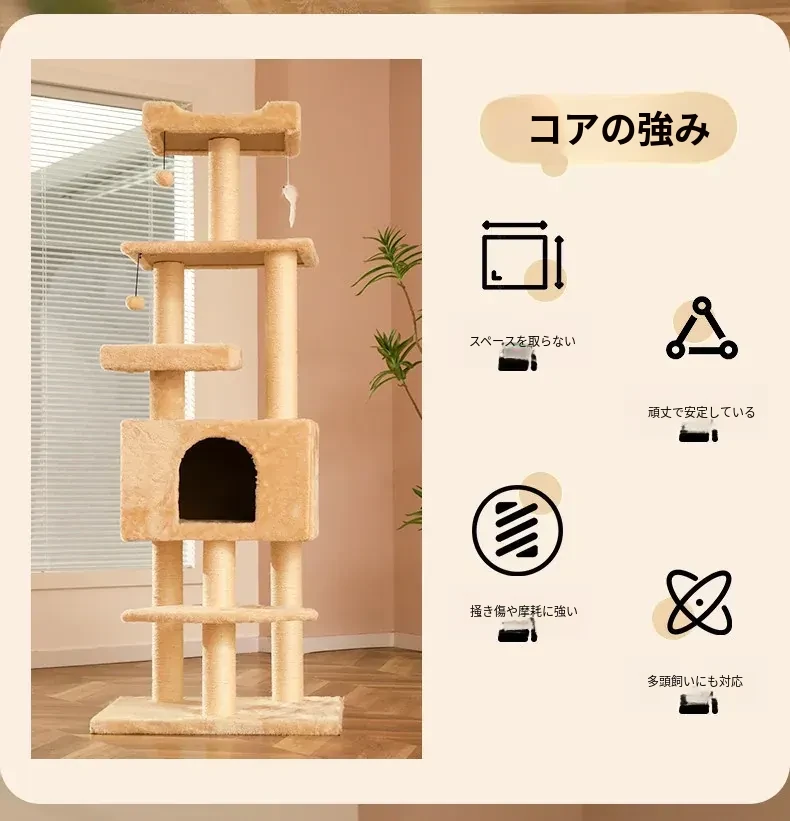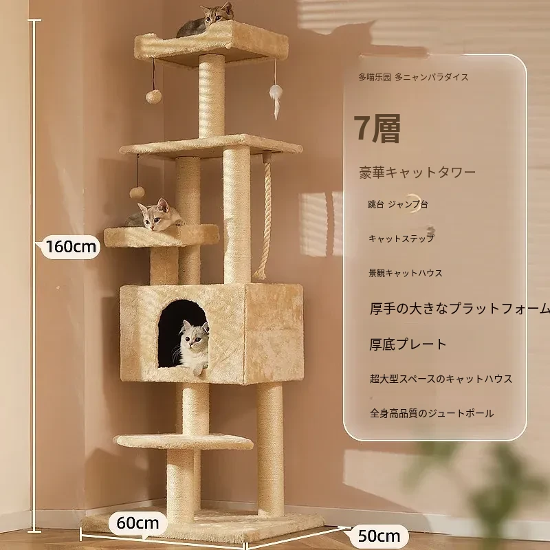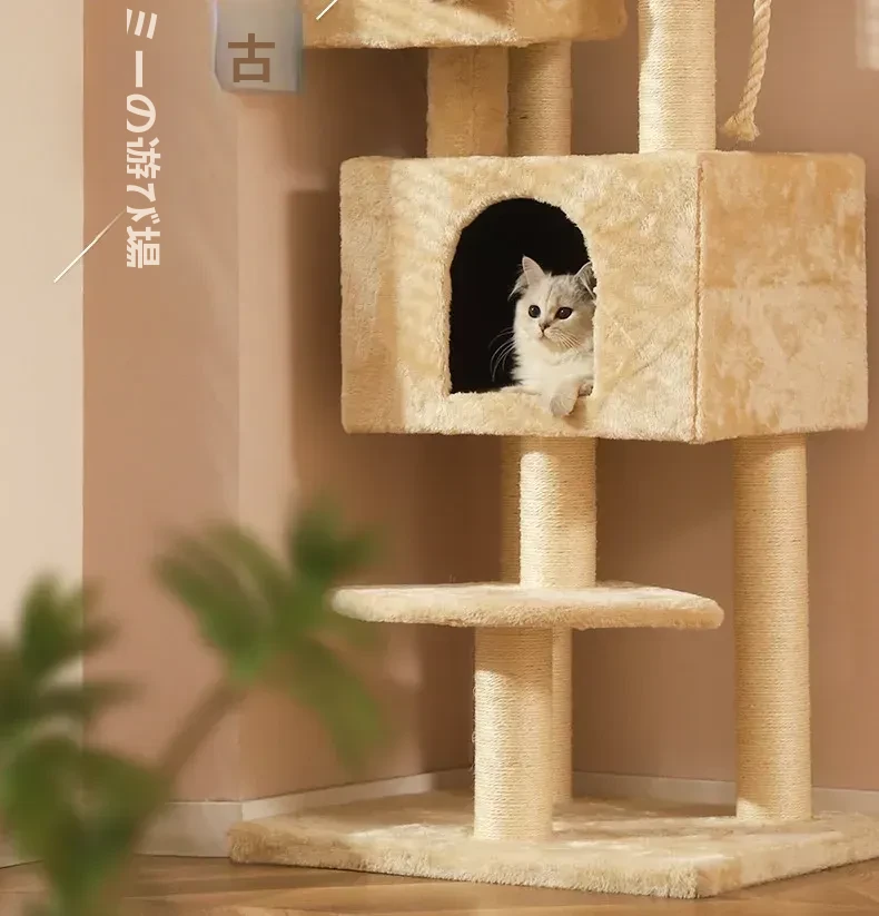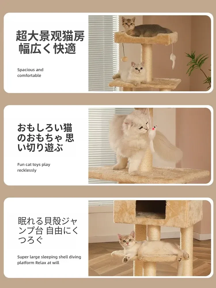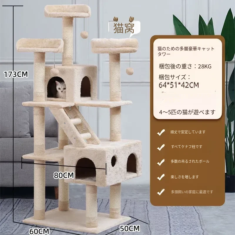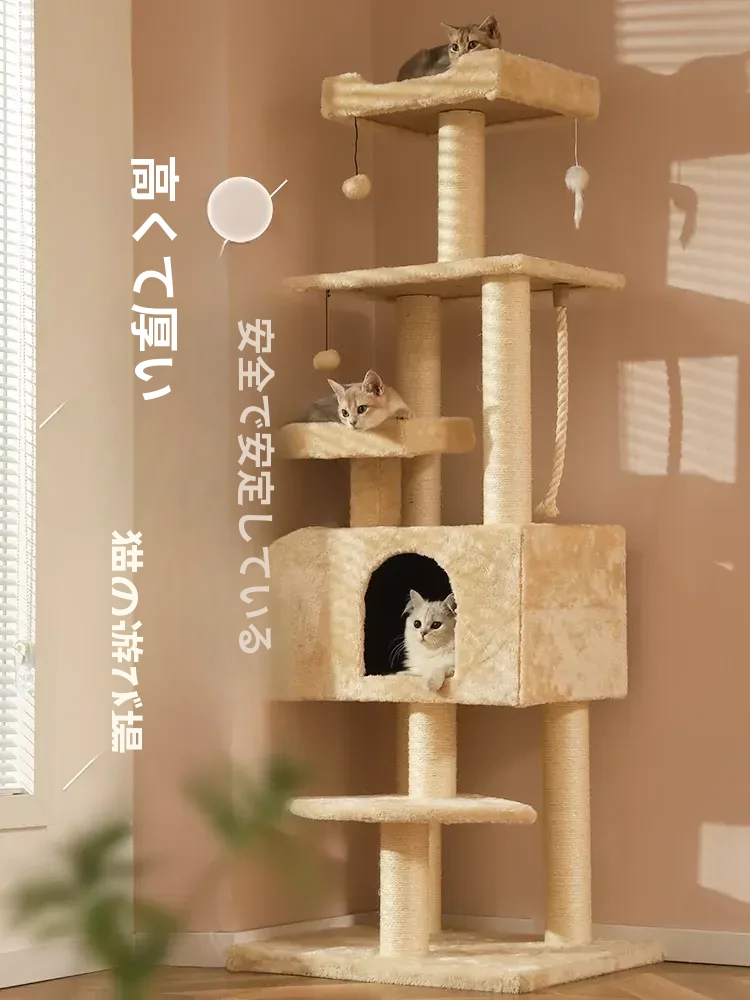 キャットタワー&キャットハウス一体型!おしゃれで機能的な大容量キャットツリー、愛猫のための快適な遊び場。高い爪研ぎポール付きで、元気な猫ちゃんも大満足!家庭用に最適な大型キャットフレームです。