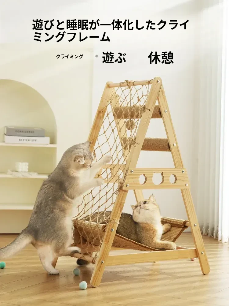 キャットタワー&キャットハウス一体型!小型猫専用の天然木製キャットクライミングフレーム。爪とぎボード付きで、遊びながら爪を研げる!愛猫のための快適なスペースを提供します。