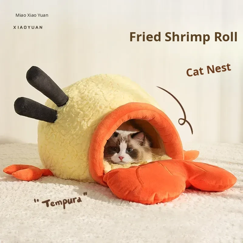 Meow Cozy | Dual-Use Deep-Fried Shrimp Roll Cat Bed - Enclosed Design with Winter Warmth Mat for Cats and Dogs - Perfect for Cozy Sleep in Winter