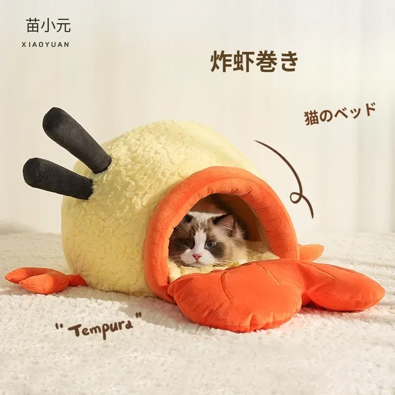 ニャン小元|冬にぴったり!ふわふわの揚げエビロール型キャットハウス・クローズドタイプ、暖かいマット付き。猫ちゃんもワンちゃんも快適におやすみ!