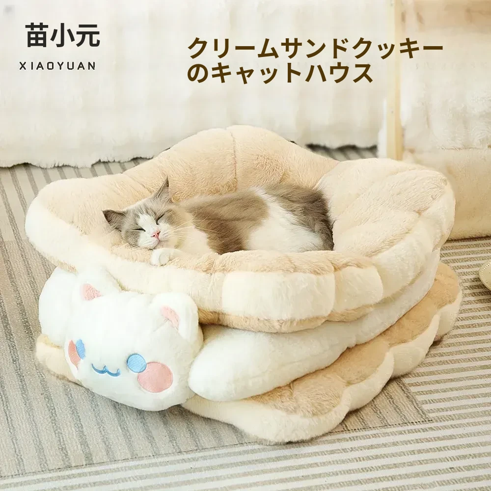 ミャオシャオユエ|ふわふわのクッキーサンドキャットベッド、冬の暖かさを保つペットハウス、厚手で柔らかい、冬にぴったりの子猫用キャットハウス!